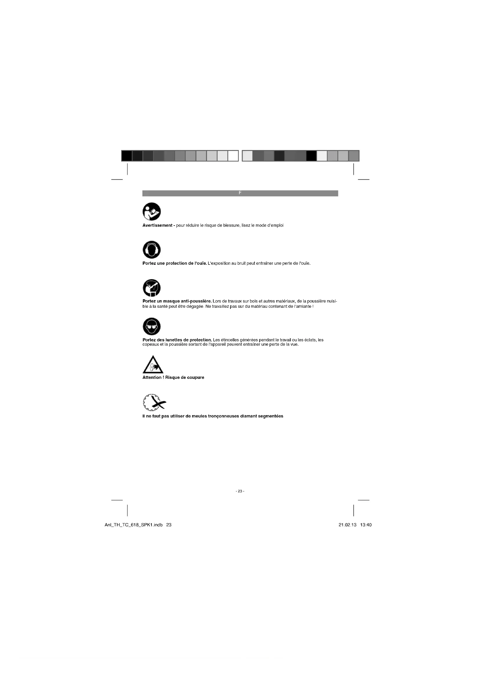 Avertissement - pour réduire le risque de blessure, lisez le mode d‘emploi Portez une protection de l‘ouïe. L‘exposition au bruit peut entraîner une perte de l‘ouïe. Portez des lunettes de protection. Les étincelles générées pendant le travail ou les éclats, les copeaux et la poussière sortant de l‘appareil peuvent entraîner une perte de la vue. Portez un masque anti-poussière. Lors de travaux sur bois et autres matériaux, de la poussière nuisi- ble à la santé peut être dégagée. Ne travaillez pas sur du matériau contenant de l‘amiante ! Attention ! Risque de coupure Il ne faut pas utiliser de meules tronçonneuses diamant segmentées Anl_TH_TC_618_SPK1.indb 23Anl_TH_TC_618_SPK1.indb 23 21.02.13 13:4021.02.13 13:40F