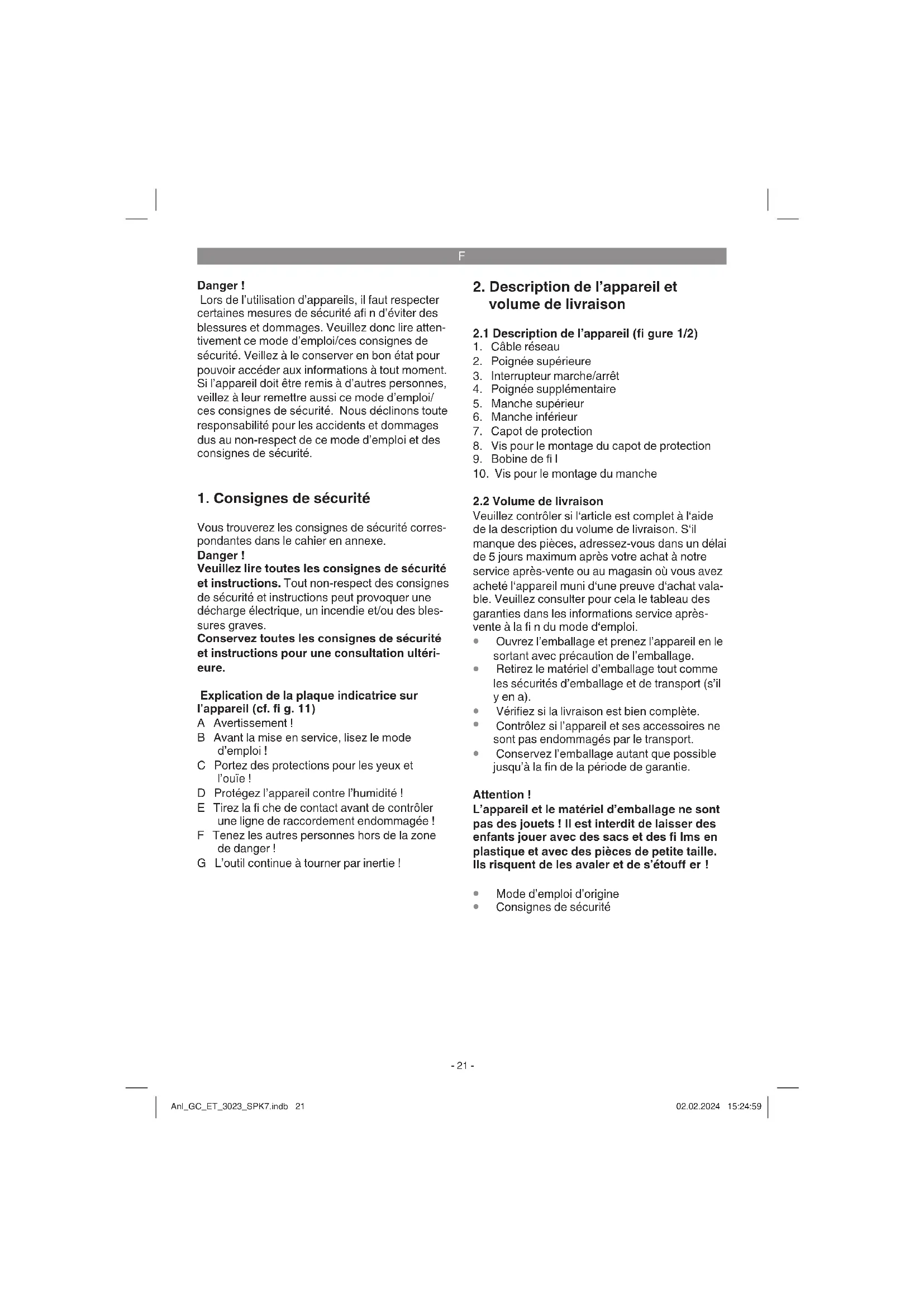 raccordement réseau Si la ligne de raccordement réseau de cet ap- pareil est endommagée, il faut la faire remplacer par le producteur ou son service après-vente ou par une personne de qualifi cation semblable afi n d’éviter tout risque. Anl_GC_ET_3023_SPK7.indb 23Anl_GC_ET_3023_SPK7.indb 23 02.02.2024 15:24:5902.02.2024 15:24:59F