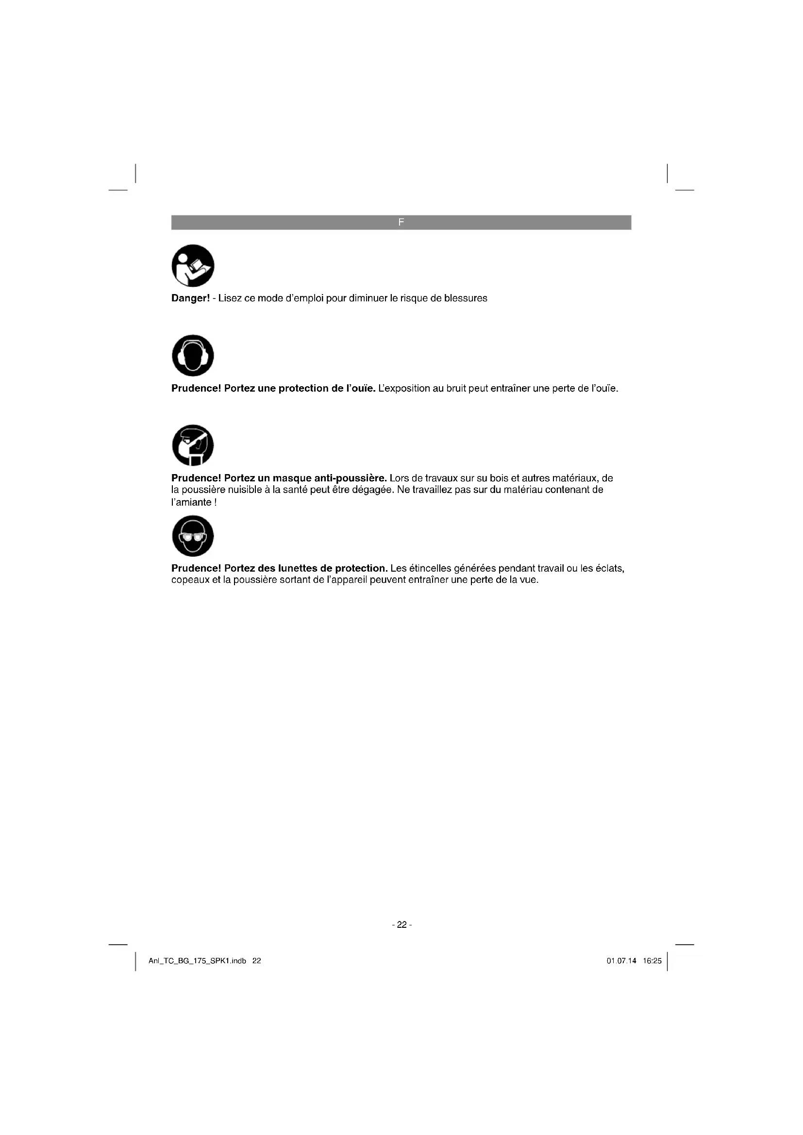 Danger! - Lisez ce mode d’emploi pour diminuer le risque de blessures Prudence! Portez une protection de l’ouïe. L’exposition au bruit peut entraîner une perte de l’ouïe. Prudence! Portez des lunettes de protection. Les étincelles générées pendant travail ou les éclats, copeaux et la poussière sortant de l’appareil peuvent entraîner une perte de la vue. Prudence! Portez un masque anti-poussière. Lors de travaux sur su bois et autres matériaux, de la poussière nuisible à la santé peut être dégagée. Ne travaillez pas sur du matériau contenant de l’amiante ! Anl_TC_BG_175_SPK1.indb 22Anl_TC_BG_175_SPK1.indb 22 01.07.14 16:2501.07.14 16:25F