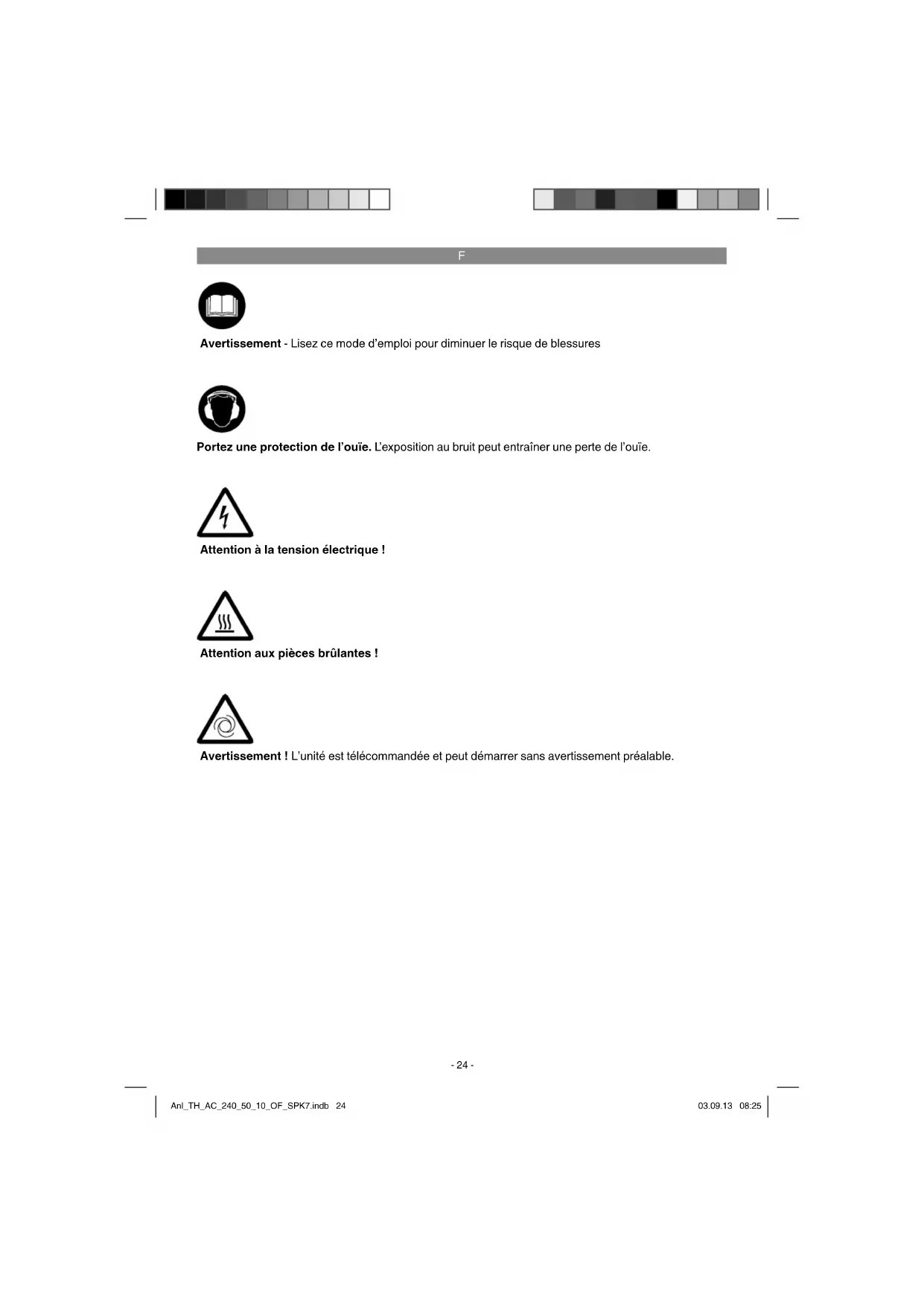 Attention à la tension électrique ! Attention aux pièces brûlantes ! Avertissement ! L’unité est télécommandée et peut démarrer sans avertissement préalable. Portez une protection de l’ouïe. L’exposition au bruit peut entraîner une perte de l’ouïe. Avertissement - Lisez ce mode d’emploi pour diminuer le risque de blessures Anl_TH_AC_240_50_10_OF_SPK7.indb 24Anl_TH_AC_240_50_10_OF_SPK7.indb 24 03.09.13 08:2503.09.13 08:25F