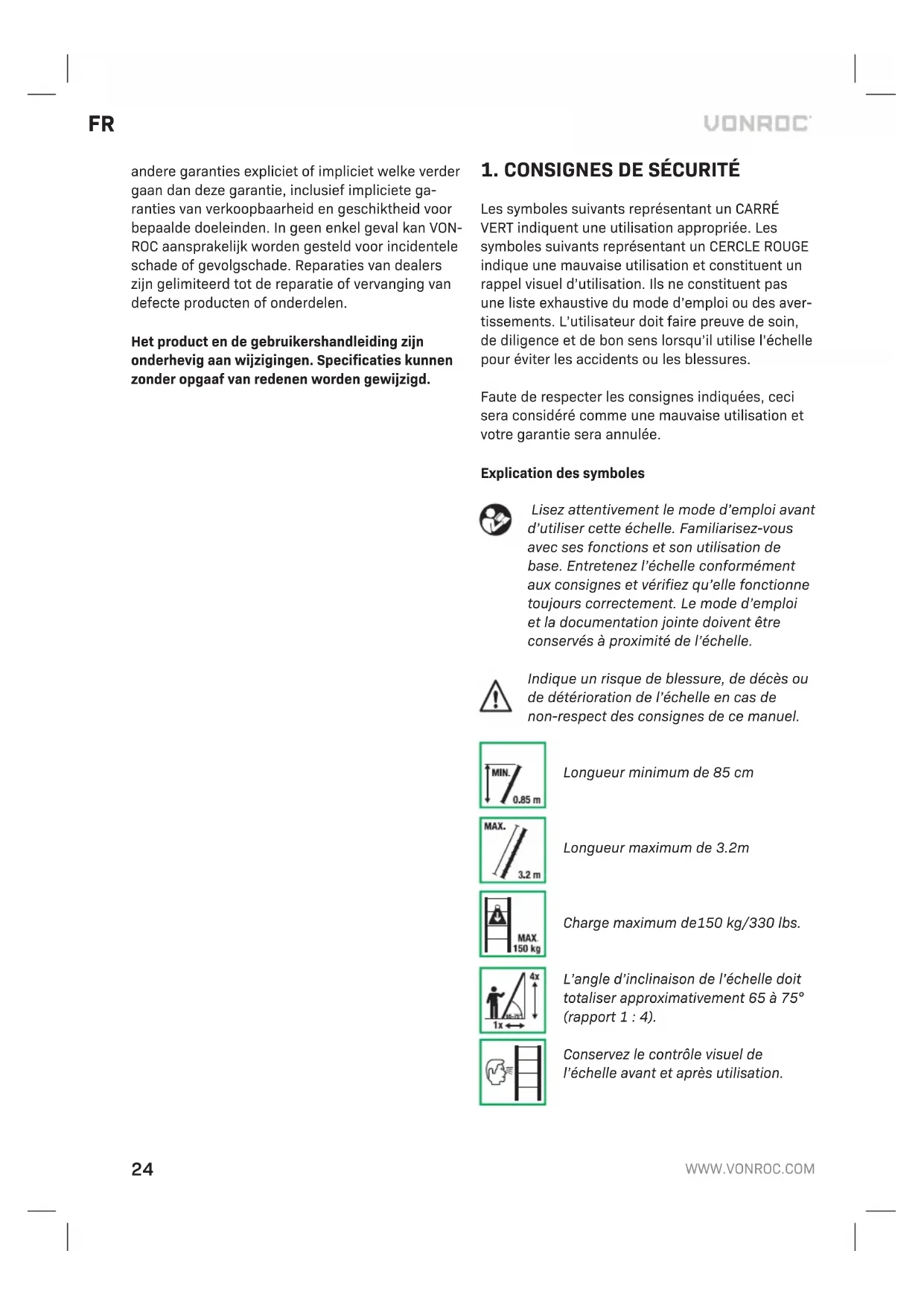 ettoyage Nettoyer régulièrement l’appareil, de préférence après chaque utilisation. Nettoyez avec un produit d’entretien ménager adapté et un chiffon doux et sec. N’immergez pas l’échelle dans l’eau ou dans un liquide quelconque pour quelque raison que ce soit.N’utilisez pas de solvant (essence, alcool, ammoniaque, etc.) car ces substances peuvent endommager les pièces en plastique. Stockage Stockez votre échelle à l’intérieur, dans un lieu sec et à l’écart des contaminants. Ne faites pas reposer d’autres objets sur l’échelle. Ne stockez l’échelle qu’une fois sèche. N’exposez pas votre système d’échelle à des environnements humides ou mouillés qui l’endommagent. Stockez-la dans le bon sens. La base doit toujours reposer au sol. Stockez-la hors de portée des enfants. Entretien N’utilisez jamais une échelle télescopique endom- magée ou cassée. Les réparations temporaires sont interdites. Vérifiez les pieds en plastique de l’échelle avant et après utilisation. N’utilisez pas l’échelle sans les pieds en plastique ou lorsque ces derniers sont usés. L’échelle est équipée de couvercles en plastique en haut afin d’empêcher la poussière et les contaminants d’y pénétrer. N’utilisez pas l’échelle sans les couvercles en plastique. Conservez toujours le contrôle visuel de l’échelle avant et après utilisation. Les réparations et l’entretien doivent être ef- fectués par une personne compétente avec les pièces de rechange adaptées. Les pièces tierces non approuvées sont déconseillées et annulent votre garantie. GARANTIE Les produits VONROC sont développés aux plus hau- ts standards de qualité et ils sont garantis contre les défauts de pièces et de main d’oeuvre pendant la durée légale stipulée à partir de la date d’achat d’o- rigine du produit. En cas d’une quelconque panne du produit pendant cette durée qui serait due à un défaut matériel et/ou de main d’oeuvre, contactez directement VONROC. Les circonstances suivantes ne sont pas prises en charge par la garantie: