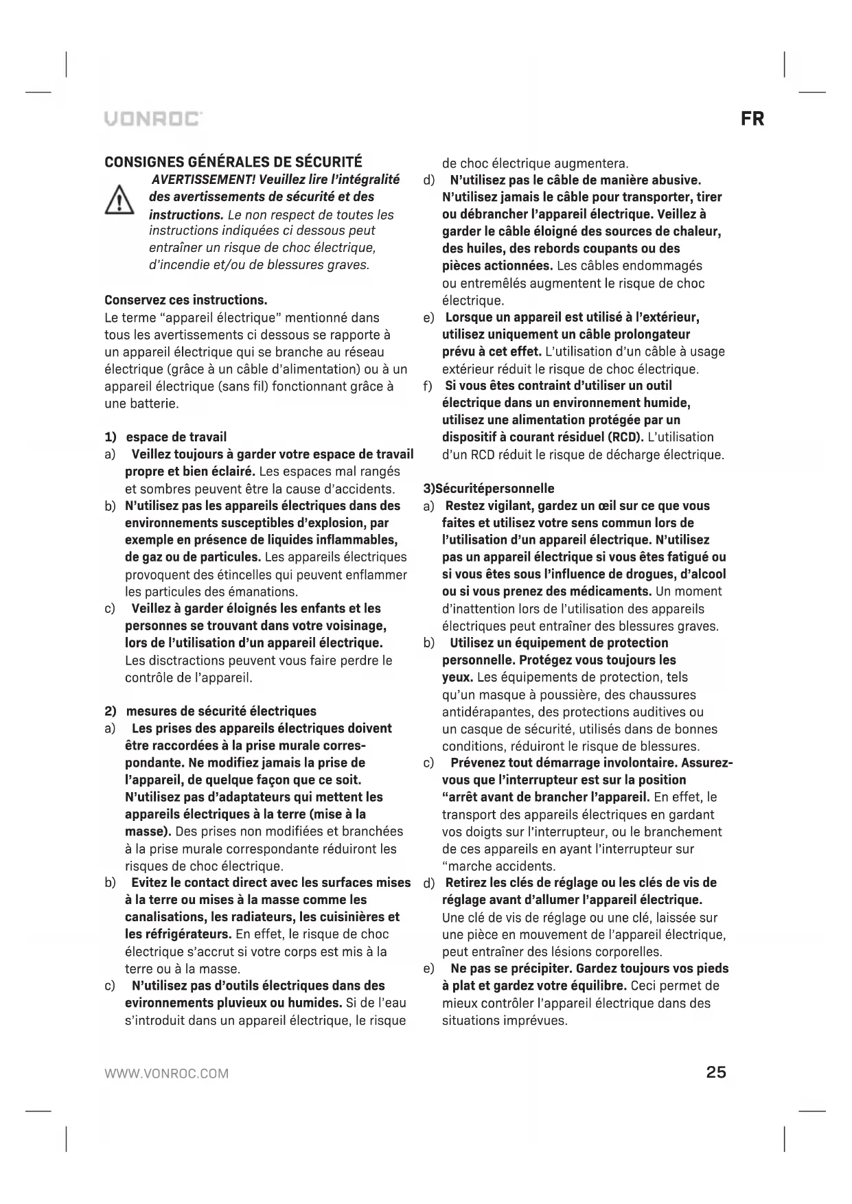 Uniquement pour les pays de l’UE Ne jetez pas les outils électriques avec les déchets domestiques. Selon la Directive européenne 2012/19/CE relative aux déchets d’équipements électriques et électroniques et sa mise en œuvre dans le droit national, les outils électriques hors d’usage doivent être collectés séparément et mis au rebut de manière écologique. GARANTIE Les produits VONROC sont développés aux plus hau- ts standards de qualité et ils sont garantis contre les défauts de pièces et de main d’oeuvre pendant la durée légale stipulée à partir de la date d’achat d’o- rigine du produit. En cas d’une quelconque panne du produit pendant cette durée qui serait due à un défaut matériel et/ou de main d’oeuvre, contactez directement VONROC. Les circonstances suivantes ne sont pas prises en charge par la garantie: