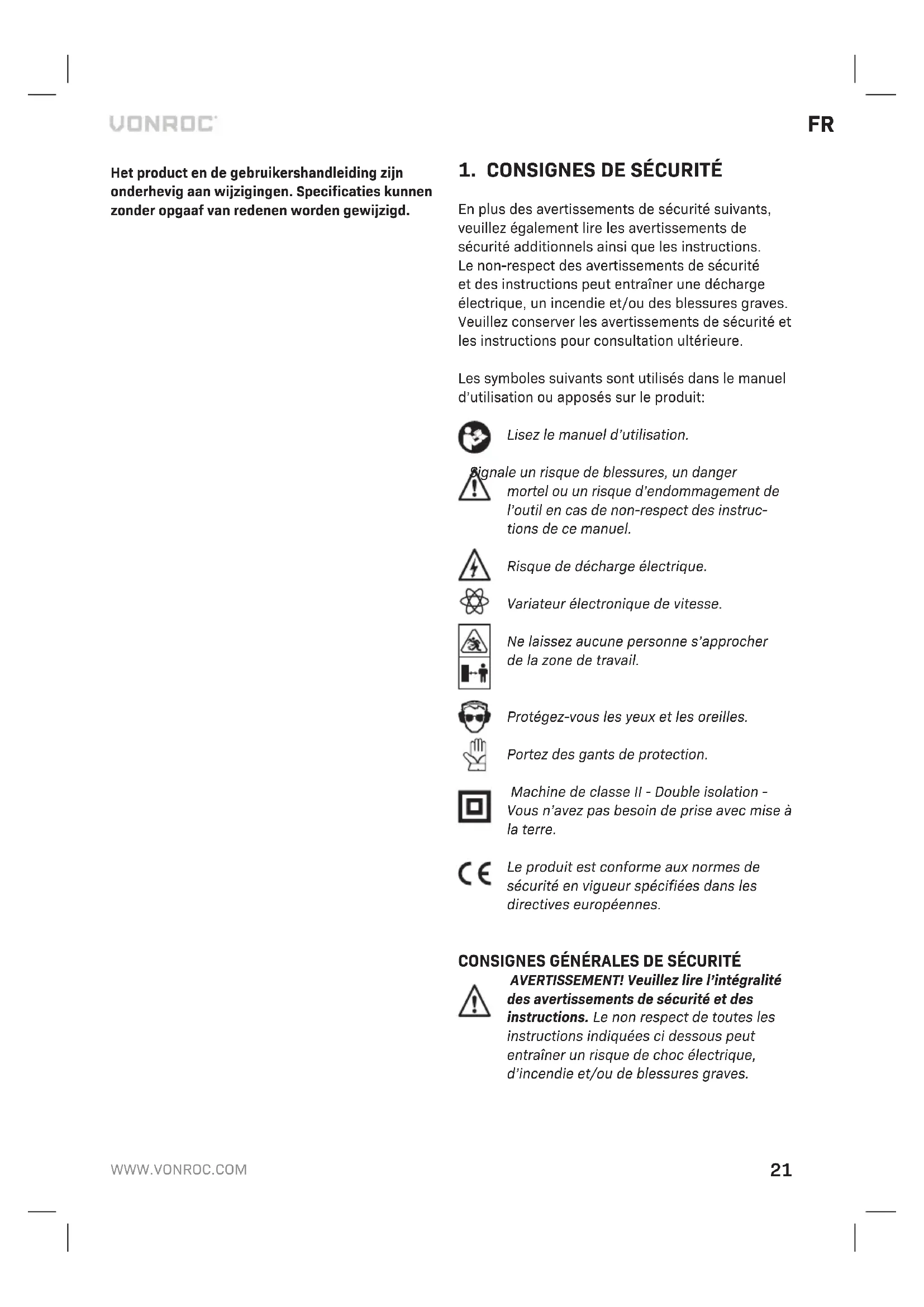 Avant le nettoyage et la maintenance, mettez toujours la machine hors tension et débranchez la fiche de la prise secteur. Nettoyez le corps de la machine régulièrement au moyen d’un chiffon doux, de préférence après cha- que utilisation. Vérifiez que les ouvertures d’aérati- on ne sont pas obstruées ni sales. Utilisez un chif- fon doux légèrement humidifié avec de la mousse de savon pour nettoyer les taches persistantes. N’utilisez pas de produits de nettoyage tels que l’essence, l’alcool, l’ammoniac, etc.; ces produits peuvent endommager les parties synthétiques. ENVIRONNEMENT Les équipements électroniques ou électriques défectueux ou destinés à être mis au rebut doivent être déposés aux points de recyclage appropriés. Uniquement pour les pays de l’UE Ne jetez pas les outils électriques avec les déchets domestiques. Selon la Directive européenne 2012/19/CE relative aux déchets d’équipements électriques et électroniques et sa mise en œuvre dans le droit national, les outils électriques hors d’usage doivent être collectés séparément et mis au rebut de manière écologique. GARANTIE Les produits VONROC sont développés aux plus hauts standards de qualité et ils sont garantis contre les défauts de pièces et de main d’oeuvre pendant la durée légale stipulée à partir de la date d’achat d’origine du produit. En cas d’une quelconque panne du produit pendant cette durée qui serait due à un défaut matériel et/ou de main d’oeuvre, contactez directement VONROC. Les circonstances suivantes ne sont pas prises en charge par la garantie: