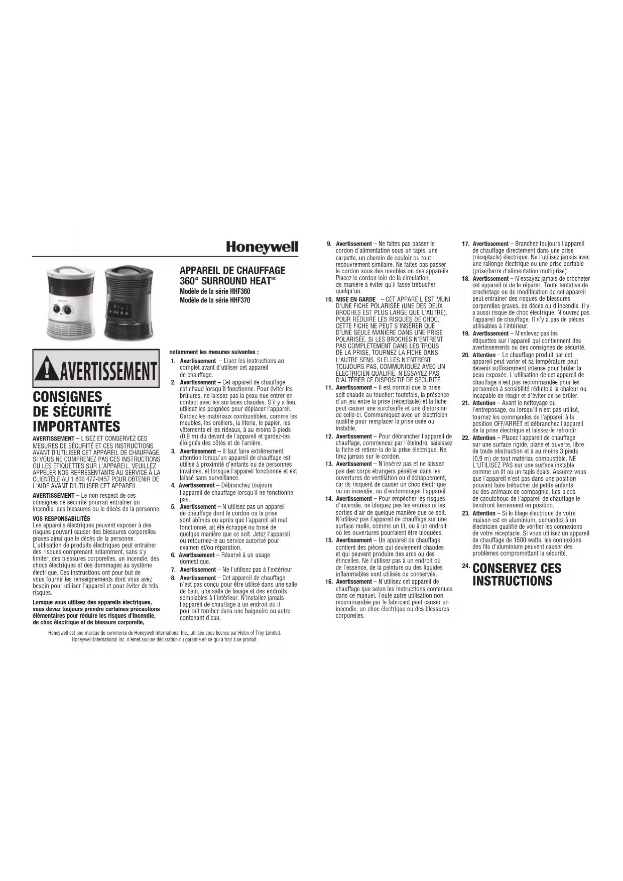 Retrouvez gratuitement la notice de l'appareil 360° Surround Heater HHF370B HONEYWELL au format PDF.