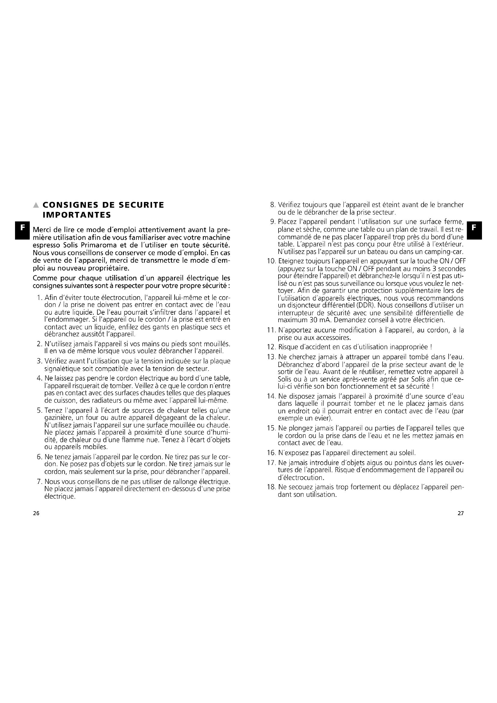 IMPORTANTES Merci de lire ce mode d´emploi attentivement avant la pre- mière utilisation afin de vous familiariser avec votre machine espresso Solis Primaroma et de l´utiliser en toute sécurité. Nous vous conseillons de conserver ce mode d´emploi. En cas de vente de l´appareil, merci de transmettre le mode d´em- ploi au nouveau propriétaire. Comme pour chaque utilisation d´un appareil électrique les consignes suivantes sont à respecter pour votre propre sécurité :