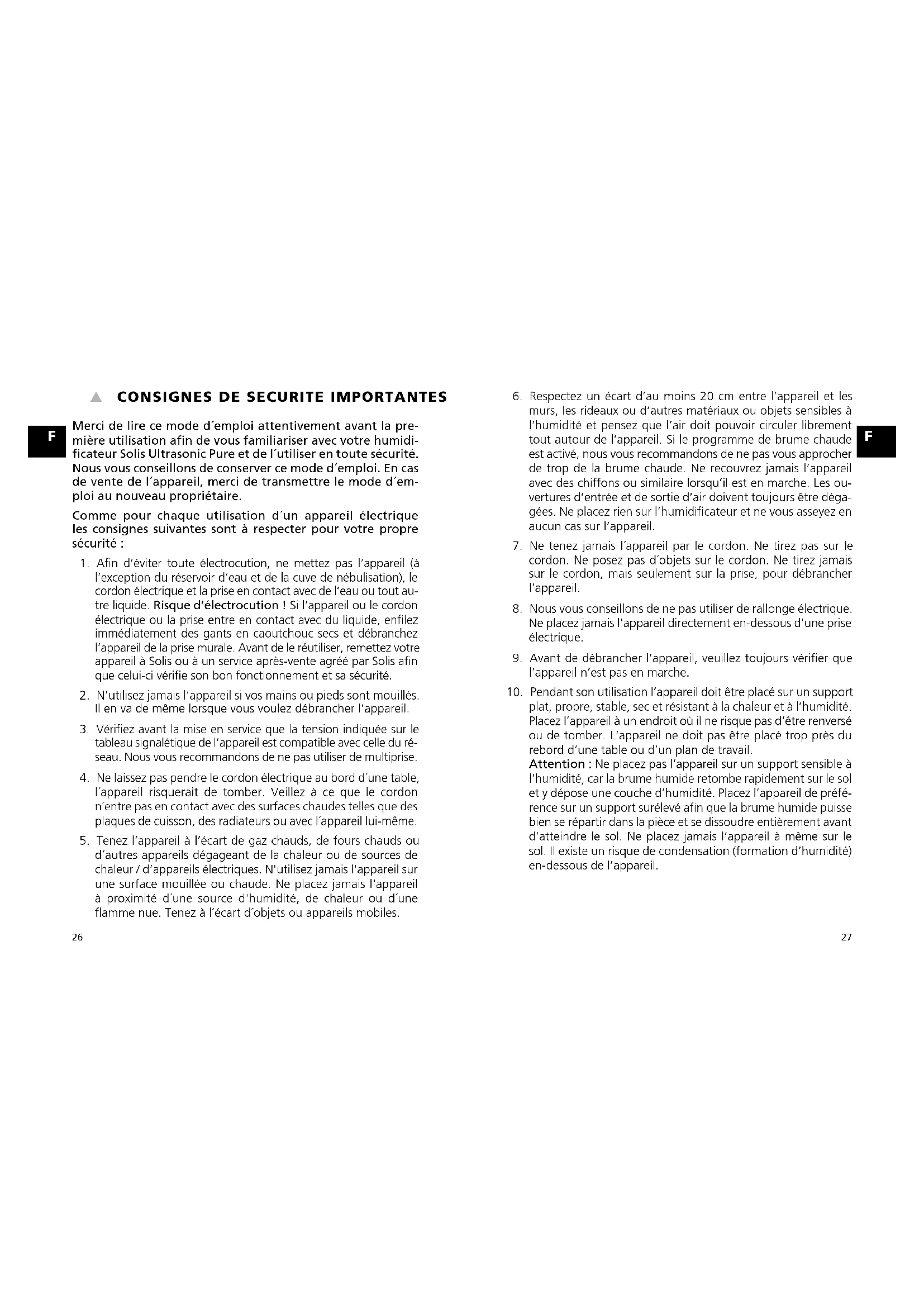 Merci de lire ce mode d´emploi attentivement avant la pre- mière utilisation afin de vous familiariser avec votre humidi- ficateur Solis Ultrasonic Pure et de l´utiliser en toute sécurité. Nous vous conseillons de conserver ce mode d´emploi. En cas de vente de l´appareil, merci de transmettre le mode d´em- ploi au nouveau propriétaire. Comme pour chaque utilisation d´un appareil électrique les consignes suivantes sont à respecter pour votre propre sécurité :