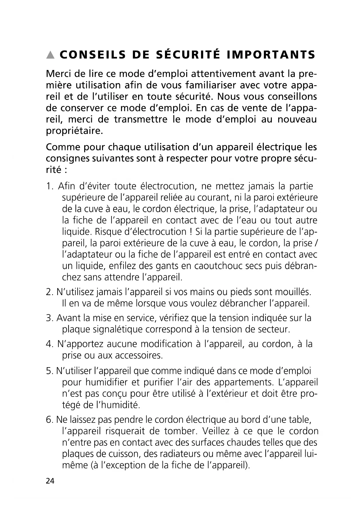 Merci de lire ce mode d’emploi attentivement avant la pre- mière utilisation afin de vous familiariser avec votre appa- reil et de l’utiliser en toute sécurité. Nous vous conseillons de conserver ce mode d’emploi. En cas de vente de l’appa- reil, merci de transmettre le mode d’emploi au nouveau propriétaire. Comme pour chaque utilisation d’un appareil électrique les consignes suivantes sont à respecter pour votre propre sécu- rité :