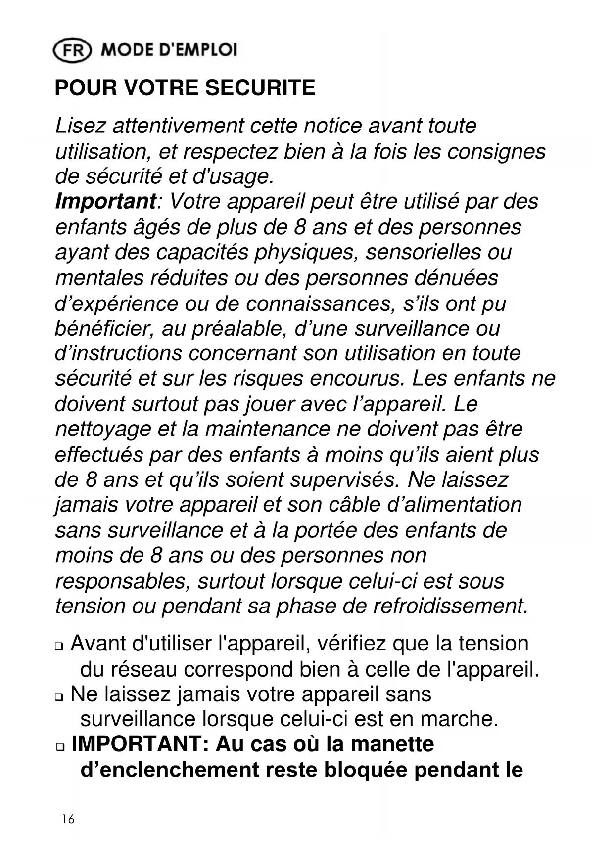 Lisez attentivement cette notice avant toute utilisation, et respectez bien à la fois les consignes de sécurité et d'usage. Important: Votre appareil peut être utilisé par des enfants âgés de plus de 8 ans et des personnes ayant des capacités physiques, sensorielles ou mentales réduites ou des personnes dénuées d’expérience ou de connaissances, s’ils ont pu bénéficier, au préalable, d’une surveillance ou d’instructions concernant son utilisation en toute sécurité et sur les risques encourus. Les enfants ne doivent surtout pas jouer avec l’appareil. Le nettoyage et la maintenance ne doivent pas être effectués par des enfants à moins qu’ils aient plus de 8 ans et qu’ils soient supervisés. Ne laissez jamais votre appareil et son câble d’alimentation sans surveillance et à la portée des enfants de moins de 8 ans ou des personnes non responsables, surtout lorsque celui-ci est sous tension ou pendant sa phase de refroidissement. Avant d'utiliser l'appareil, vérifiez que la tension du réseau correspond bien à celle de l'appareil. Ne laissez jamais votre appareil sans surveillance lorsque celui-ci est en marche. IMPORTANT: Au cas où la manette d’enclenchement reste bloquée pendant le17
