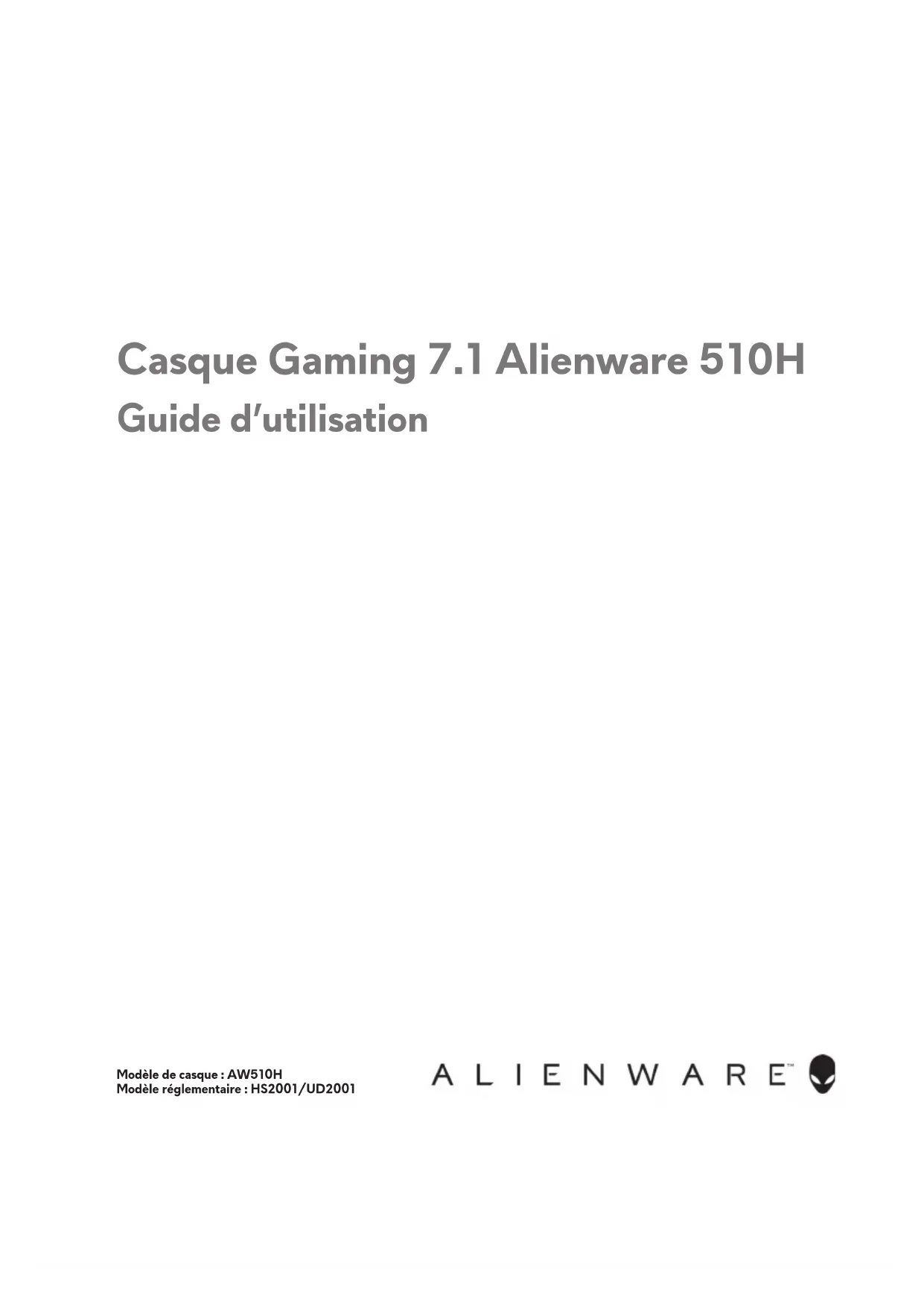 Modèle de casque : AW510H Modèle réglementaire : HS2001/UD2001 Casque Gaming 7.1 Alienware 510H Guide d’utilisationRemarques, mises en garde et avertissements REMARQUE : Une REMARQUE signale des informations importantes pour vous aider à mieux utiliser votre ordinateur. MISE EN GARDE : Une MISE EN GARDE signale un risque de dommage matériel ou de perte de données si les instructions ne sont pas suivies.