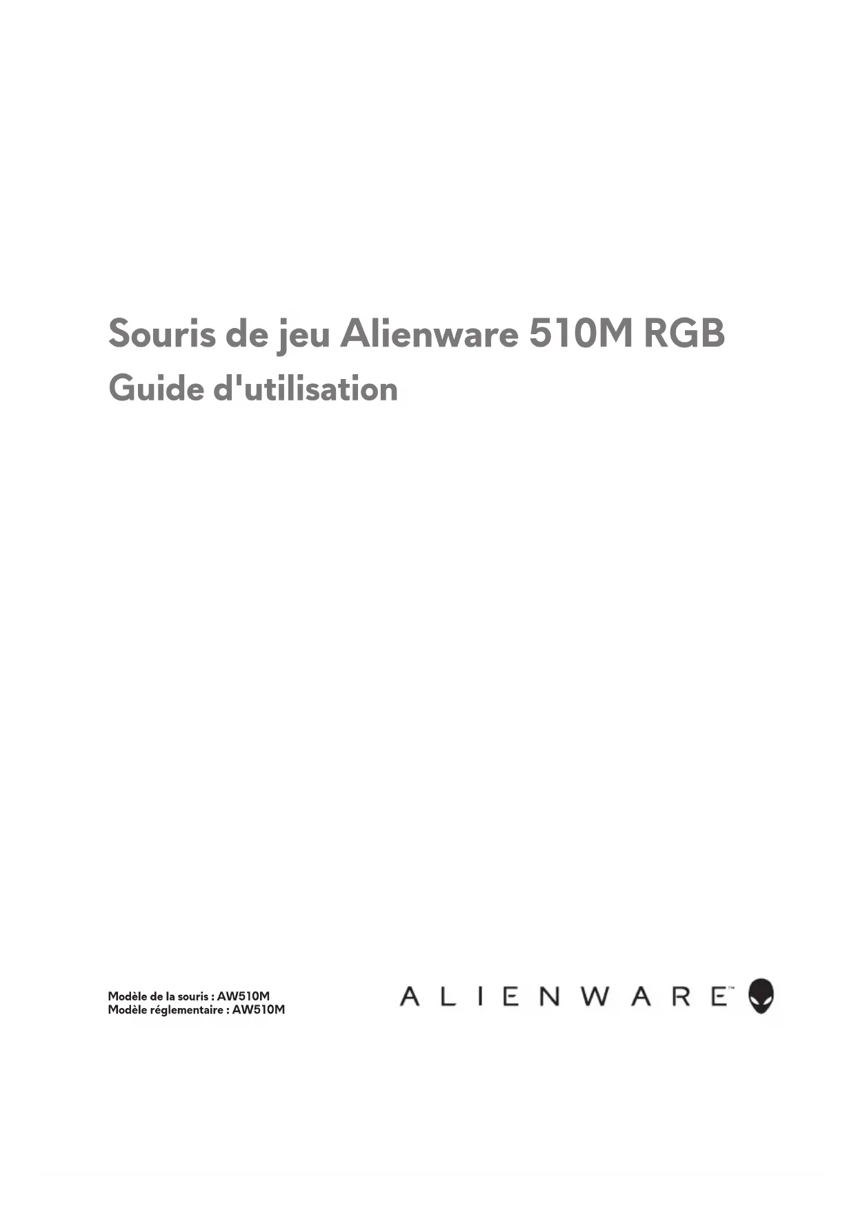 Modèle de la souris : AW510M Modèle réglementaire : AW510M Souris de jeu Alienware 510M RGB Guide d'utilisationRemarques, Avertissements et Attention REMARQUE : Une REMARQUE indique une information importante pour vous aider à mieux utiliser votre ordinateur.