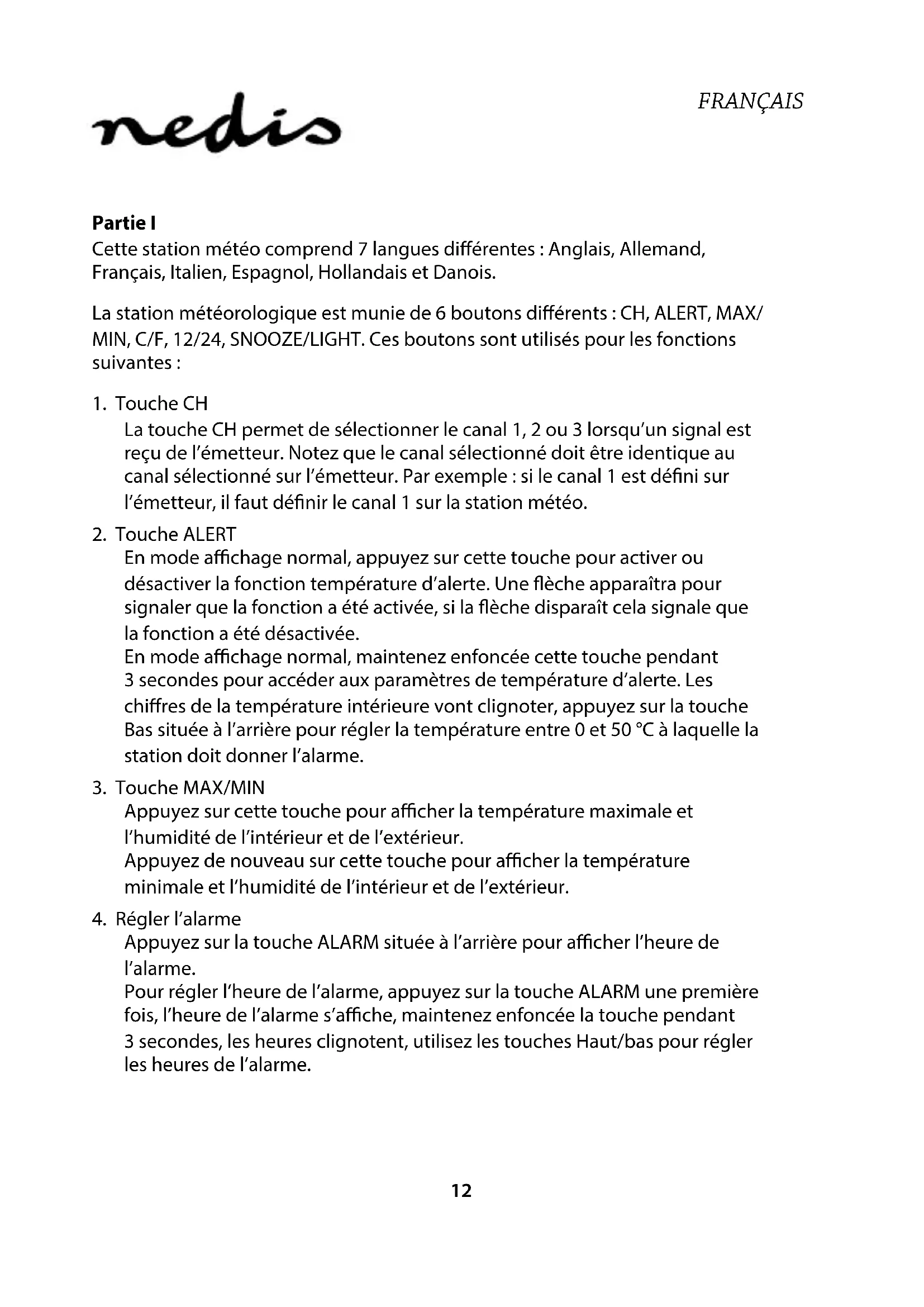 Partie I Cette station météo comprend 7 langues diérentes : Anglais, Allemand, Français, Italien, Espagnol, Hollandais et Danois. La station météorologique est munie de 6 boutons diérents : CH, ALERT, MAX/ MIN, C/F, 12/24, SNOOZE/LIGHT. Ces boutons sont utilisés pour les fonctions suivantes :