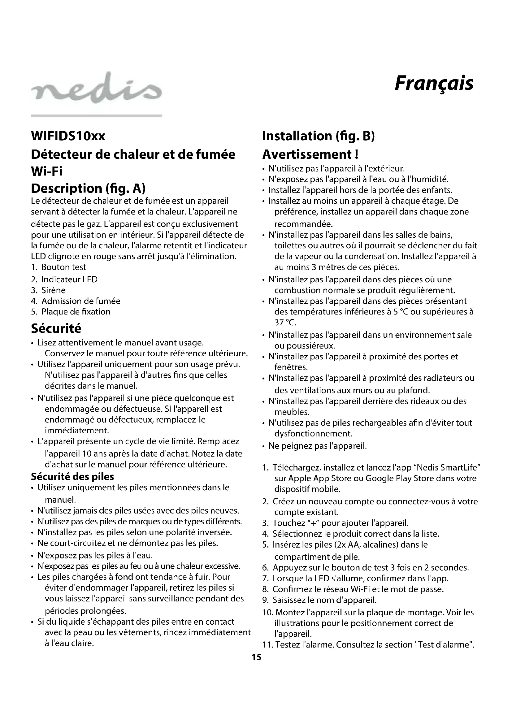 WIFIDS10xx Détecteur de chaleur et de fumée Wi-Fi Description (g. A) Le détecteur de chaleur et de fumée est un appareil servant à détecter la fumée et la chaleur. L'appareil ne détecte pas le gaz. L'appareil est conçu exclusivement pour une utilisation en intérieur. Si l'appareil détecte de la fumée ou de la chaleur, l'alarme retentit et l'indicateur LED clignote en rouge sans arrêt jusqu'à l'élimination.