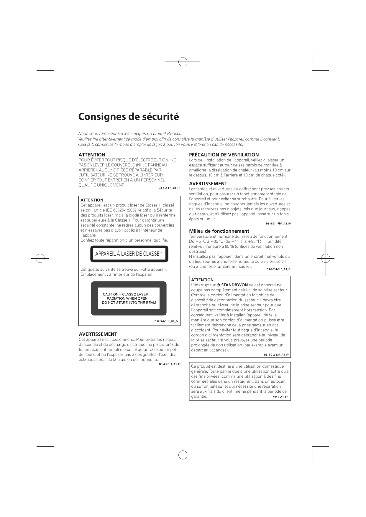 ATTENTION Cet appareil est un produit laser de Classe 1, classé selon l’article IEC 60825-1:2007 relatif à la Sécurité des produits laser, mais la diode laser qu’il renferme est supérieure à la Classe 1. Pour garantir une sécurité constante, ne retirez aucun des couvercles et n’essayez pas d’avoir accès à l’intérieur de l’appareil.