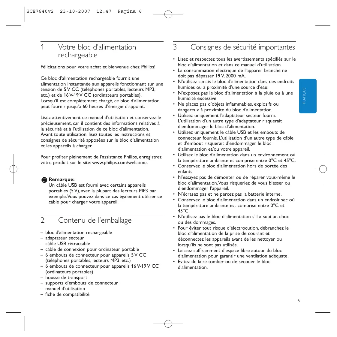 Ce bloc d’alimentation rechargeable fournit une alimentation instantanée aux appareils fonctionnant sur une tension de 5 V CC (téléphones portables, lecteurs MP3, etc.) et de 16 V-19 V CC (ordinateurs portables). Lorsqu’il est complètement chargé, ce bloc d’alimentation peut fournir jusqu’à 60 heures d’énergie d’appoint. Lisez attentivement ce manuel d’utilisation et conservez-le précieusement, car il contient des informations relatives à la sécurité et à l’utilisation de ce bloc d’alimentation. Avant toute utilisation, lisez toutes les instructions et consignes de sécurité apposées sur le bloc d’alimentation et les appareils à charger. Pour profiter pleinement de l’assistance Philips, enregistrez votre produit sur le site: www.philips.com/welcome. Remarque: Un cáble USB est fourni avec certains appareils portables (5 V), avec la plupart des lecteurs MP3 par exemple.Vous pouvez dans ce cas également utiliser ce cáble pour charger votre appareil.