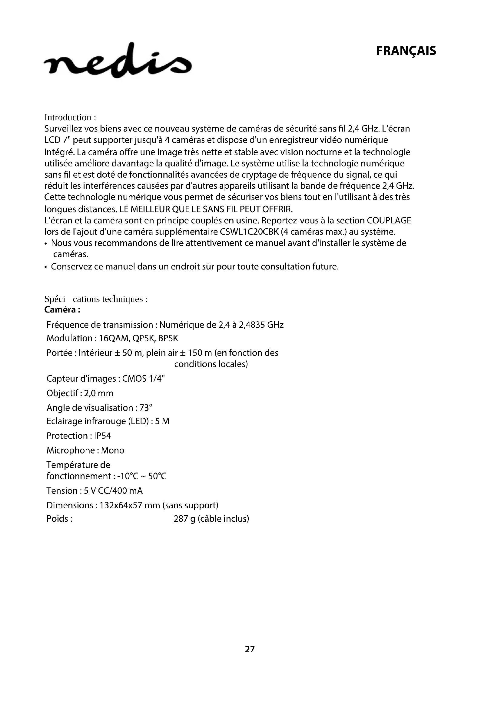 - Conservez ce manuel dans un endroit sûr pour toute consultation future. Spécications techniques : Caméra : Fréquence de transmission : Numérique de 2,4 à 2,4835 GHz Modulation : 16QAM, QPSK, BPSK Portée : Intérieur ± 50 m, plein air ± 150 m (en fonction des conditionslocales) Capteur d'images : CMOS 1/4" Objectif : 2,0 mm Angle de visualisation : 73° Eclairage infrarouge (LED) : 5 M Protection : IP54 Microphone : Mono Température de fonctionnement : -10°C ~ 50°C Tension : 5 V CC/400 mA Dimensions : 132x64x57 mm (sans support) Poids : 287 g (câble inclus)28 FRANÇAIS Ecran LCD: Fréquence de réception : Numérique de 2,4 à 2,4835 GHz Canaux : 4 Dimensions : TFT/LCD 7" Max. Résolution: 800 RGB (H)* 480 (V) pixels Carte SD: Jusqu'à 32 Go (non incluse) Taux d'images vidéo: 25 ips (max.) 10 ips (4 cameras) Fréquence d’image d'enregistrement: 25 ips par canal Résolution vidéo : CIF/VGA Formats vidéo : AVI USB : 2,0 Langue des menus : Anglais, allemand, français et néerlandais Niveau de sortie vidéo : 1 Vp-p/75 Ohms Niveau de sortie audio: 2Vrms@600 ohms mono Connecteurs de sortie audio/ vidéo: 2,5 mm (câble 2,5 mm à 3 connecteurs RCA inclus) Portée : Intérieur ± 50 m, plein air ± 150 m (en fonction des conditionslocales) Température de fonctionnement : 0°C ~ +40°C Tension : 5 V CC/650 mA Dimensions : 214x157x26 mm Poids : 488 g Consignes de sécurité :
