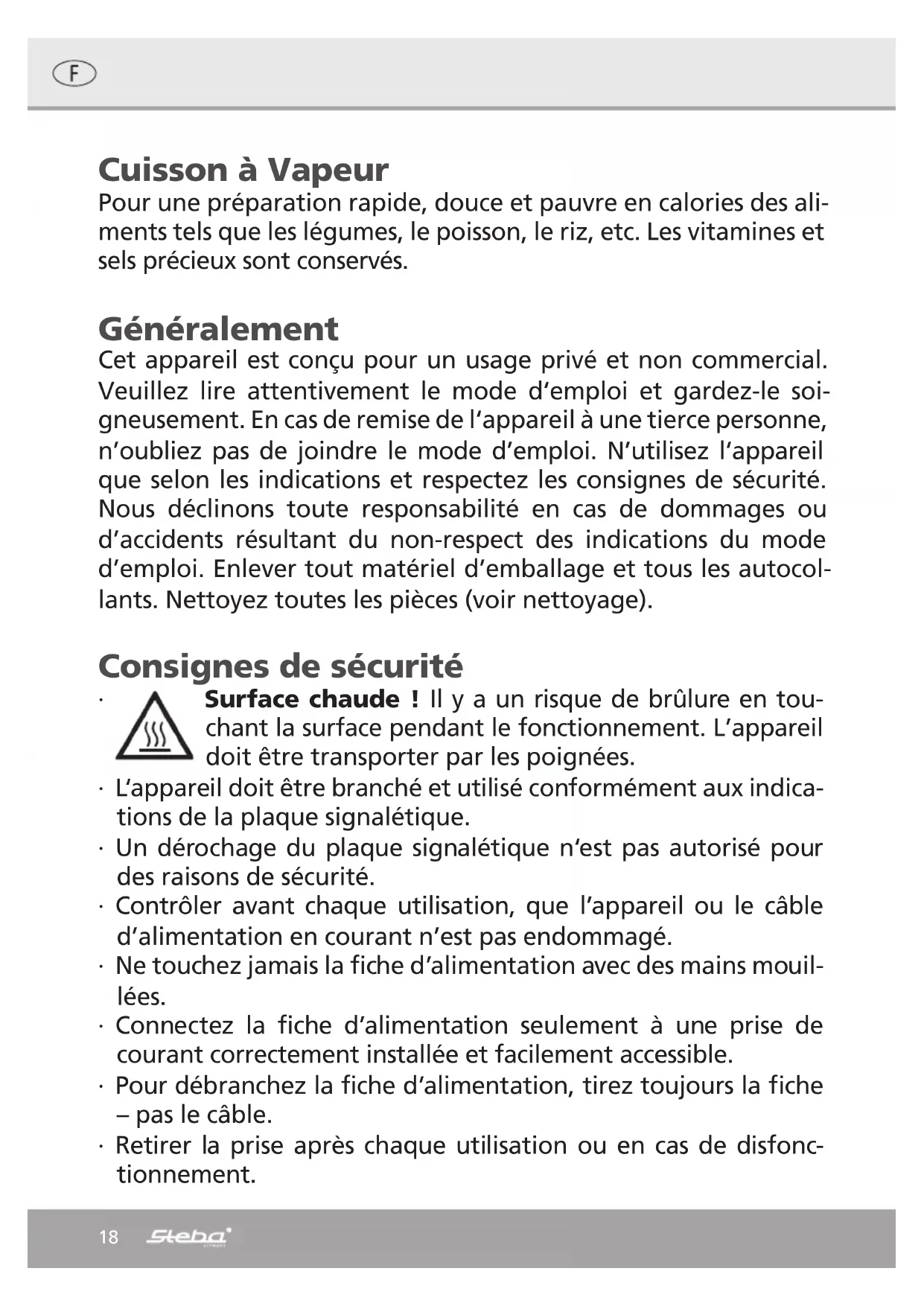 ing and if cooking time is extended. Food Type Weight / pieces Cooking time Shellfish Fresh 250 / 400 g 10 – 11 Prawn Fresh 425 g 7 Mussel Fresh 450 g 10 – 12 Crawfish Frozen 2 pieces à je 400 g 23 – 23 Fish filet Frozen Fresh 250 g 250 g 11 – 13 7 – 9 Rice Pour 200g rice and 350 ml water into the rice bowl and add spices and herbs. Fill the water tank up to the MAX marking. Put the rice bowl in the lower tray and clos with the lid. Start the program. Food Type Weight / pieces Cooking time Rice White 200 g / 300 ml 38 – 4217 Correct Disposal of this product This marking indicates that this product should not be disposed with other household wastes throughout the EU. To prevent possible harm to the envi- ronment or human health from uncontrolled waste disposal, recycle it re- sponsibly to promote the sustainable reuse of material resources. To return your used device, please use the return and collection systems or contact the retailer where the product was purchased. They can take this product for environmental safe recycling. Packaging disposal: Do not throw away the package materials. Please put it in the recycling bin. Gift box: Paper, should be put to the old paper collection point. Plastic packaging material and foils should be collected in the spe- cial collection containers. Service and Repair: If the appliance must be repaired, please get in touch with your trader or with the manufacturer: STEBA Elektrogeräte GmbH & Co KG Pointstr. 2, 96129 Strullendorf / Germany Distribution-Tel.: 09543 / 449-17 / -18, Service-Tel.: 09543 / 449-44, Fax: 09543 / 449-19 e-Mail: elektro@steba.com Internet: http://www.steba.com18 Cuisson à Vapeur Pour une préparation rapide, douce et pauvre en calories des ali- ments tels que les légumes, le poisson, le riz, etc. Les vitamines et sels précieux sont conservés. Généralement Cet appareil est conçu pour un usage privé et non commercial. Veuillez lire attentivement le mode d‘emploi et gardez-le soi- gneusement. En cas de remise de l‘appareil à une tierce personne, n’oubliez pas de joindre le mode d’emploi. N’utilisez l‘appareil que selon les indications et respectez les consignes de sécurité. Nous déclinons toute responsabilité en cas de dommages ou d’accidents résultant du non-respect des indications du mode d’emploi. Enlever tout matériel d’emballage et tous les autocol- lants. Nettoyez toutes les pièces (voir nettoyage). Consignes de sécurité ∙ Surface chaude ! Il y a un risque de brûlure en tou- chant la surface pendant le fonctionnement. L’appareil doit être transporter par les poignées. ∙ L‘appareil doit être branché et utilisé conformément aux indica- tions de la plaque signalétique. ∙ Un dérochage du plaque signalétique n‘est pas autorisé pour des raisons de sécurité. ∙ Contrôler avant chaque utilisation, que l’appareil ou le câble d’alimentation en courant n’est pas endommagé. ∙ Ne touchez jamais la fiche d’alimentation avec des mains mouil- lées. ∙ Connectez la fiche d’alimentation seulement à une prise de courant correctement installée et facilement accessible. ∙ Pour débranchez la fiche d’alimentation, tirez toujours la fiche – pas le câble. ∙ Retirer la prise après chaque utilisation ou en cas de disfonc- tionnement.19 ∙ N’arracher pas la prise et ne l’endommager pas. Ne coincer pas le câble d’alimentation. ∙ Tenir le câble d’alimentation éloigné des parties chaudes. ∙ L‘appareil peut être utilisé par des enfants à partir de 8 ans ainsi que par des personnes atteintes de déficiences phy- siques, sensorielles ou mentales, ou manquant d‘expérience et/ ou de connaissances, si elles sont surveillées ou ont été instruites de la manière d‘utiliser l‘appareil en toute sécurité et qu‘elles en ont compris les dangers potentiels. Le nettoyage et l‘entretien de l‘appareil ne doivent pas être réalisés par des enfants, sauf s‘ils sont âgés de plus de 8 ans et exécutent ces opérations sous surveillance. ∙ Tenir l‘appareil et le cordon d‘alimentation hors de portée des enfants de moins de 8 ans. ∙ Veillez á ce que des enfants ne jouent pas avec l’emballage (par exemple sac en plastique). ∙ L´appareil ne doit pas fonctionner avec une minuterie ou avec un système séparé de télécommande ! ∙ Ne laissez jamais l‘appareil sans surveillance lors de son fonc- tionnement. ∙ N‘entreposez pas l‘appareil à l‘extérieur ou dans une pièce hu- mide. ∙ Ne mettez jamais l‘appareil dans l‘eau. ∙ Laissez au moins 10 cm distance autour de l‘appareil. ∙ N‘utilisez jamais l‘appareil après un fonctionnement défaillant, par ex. s’il est tombé ou s’il a été endommagé d‘une autre ma- nière. ∙ Le fabricant ne sera pas tenu responsable en cas de mauvaise utilisation ou d‘utilisation inappropriée par non-respect du mode d‘emploi. ∙ Pour éviter tout danger, les réparations sur l‘appareil, notam- ment le remplacement d‘un câble endommagé, ne peuvent être réalisées que par un service après-vente autorisé. Seule- ment les pièces détachées original peuvent être utiliser.20 ∙ L‘appareil chauffe beaucoup, ne le transporte donc qu‘après refroidissement. ∙ N‘utilisez l‘appareil que pour les applications décrites dans le mode d‘emploi. ∙ Cet appareil est conçu pour un usage privé et similaires telles que : o dans les cuisines pour les employés dans les magasins, bureaux et autres zones industrielles o dans les propriétés agricoles et par les clients des hôtels, motels et autres établissements résidentiels o dans chambres d’hôtes ∙ Avant la première utilisation : toutes les pièces doivent être nettoyées et séchées minutieusement. Pour éliminer l‘odeur du neuf, faites chauffer l‘appareil pendant environ 15 minutes. ∙ Attention ! L´extérieur de l´appareil devient chaud. Risque de brûlures. Pendant le fonc