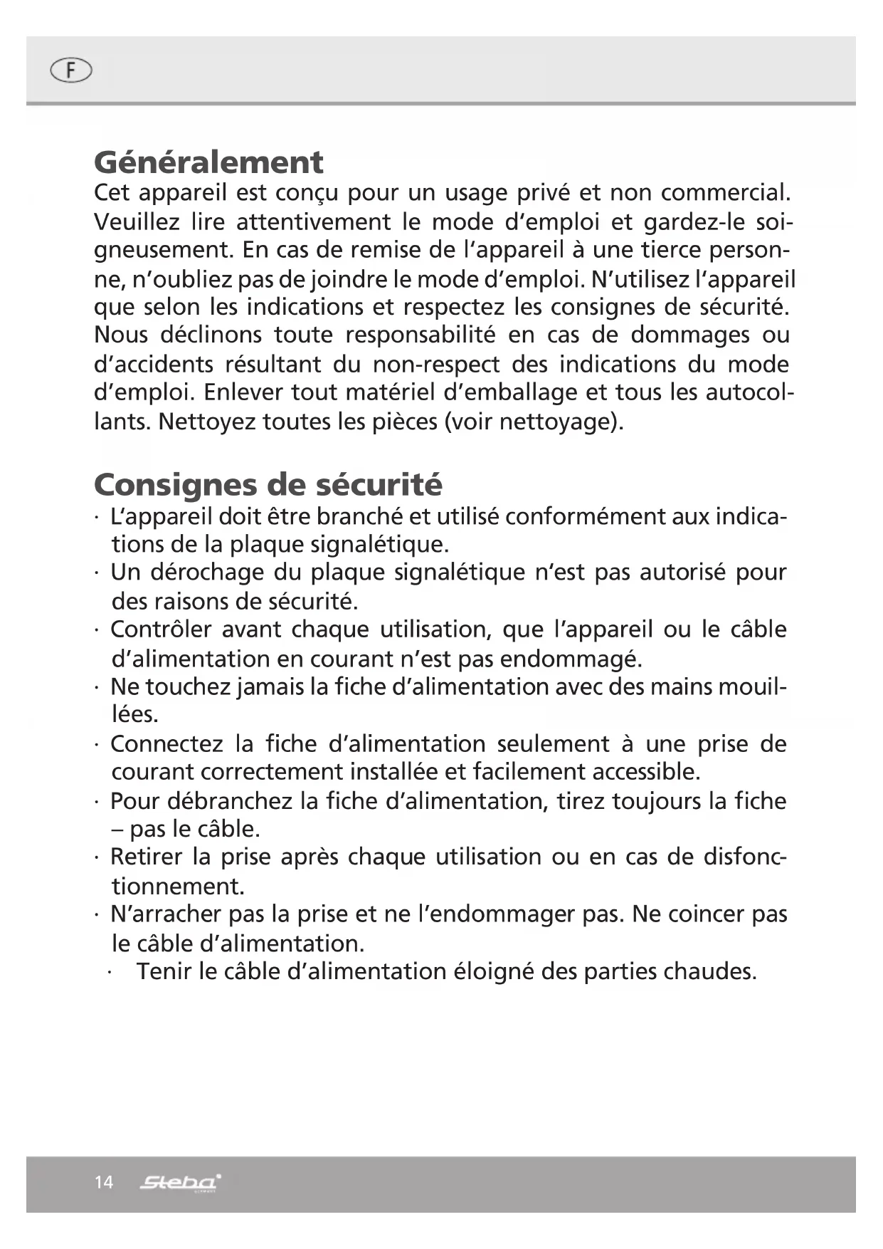 Usage ∙ Wipe the appliance and the cones with a damp cloth. Take care, that the appliance is not plugged in, as it could start with a pressure on the juice cone. ∙ Place the carrier spindle on the motor part. ∙ Put the juice container on the motor base. The spout must be placed at the opening. ∙ Put the sieve onto the juice container. ∙ Place the small juice cone onto the carrier spindle. For bigger fruit, place the bigger juice cone on the small cone. ∙ The fruit shall be cut into halves. ∙ Put the fruit halves on the juice cone. By a slight pressure on the lever-arm the juice cone rubs the juice out of the flesh. Do not press too hard, in order not to scrape the white skin which mostly tastes bitter. ∙ If you press too tight, the motor protection will react and the device will stop. Continue working with light pressure. ∙ The juice is collected in the juice collector. When the spout is moved downwards the juice will run out of the spout in a glass, which must be placed beneath the spout before. Lift the spout for collecting the juice again. ∙ It must be taken care, that the sieve gets not jammed. ∙ Never try to clean the sieve when the motor is running. The juicer must be unplugged and the sieve should be cleaned under running water. ∙ Citrus juice should be consumed quickly and stored in a metal container.13 Correct Disposal of this product This marking indicates that this product should not be disposed with other household wastes throughout the EU. To prevent possible harm to the envi- ronment or human health from uncontrolled waste disposal, recycle it re- sponsibly to promote the sustainable reuse of material resources. To return your used device, please use the return and collection systems or contact the retailer where the product was purchased. They can take this product for environmental safe recycling. Packaging disposal: Do not throw away the package materials. Please put it in the recycling bin. Gift box: Paper, should be put to the old paper collection point. Plastic packaging material and foils should be collected in the spe- cial collection containers. Service and Repair: If the appliance must be repaired, please get in touch with your trader or with the manufacturer: STEBA Elektrogeräte GmbH & Co KG Pointstr. 2, 96129 Strullendorf / Germany Distribution-Tel.: 09543 / 449-17 / -18, Service-Tel.: 09543 / 449-44, Fax: 09543 / 449-19 e-Mail: elektro@steba.com Internet: http://www.steba.com14 Généralement Cet appareil est conçu pour un usage privé et non commercial. Veuillez lire attentivement le mode d‘emploi et gardez-le soi- gneusement. En cas de remise de l‘appareil à une tierce person- ne, n’oubliez pas de joindre le mode d’emploi. N’utilisez l‘appareil que selon les indications et respectez les consignes de sécurité. Nous déclinons toute responsabilité en cas de dommages ou d’accidents résultant du non-respect des indications du mode d’emploi. Enlever tout matériel d’emballage et tous les autocol- lants. Nettoyez toutes les pièces (voir nettoyage). Consignes de sécurité ∙ L‘appareil doit être branché et utilisé conformément aux indica- tions de la plaque signalétique. ∙ Un dérochage du plaque signalétique n‘est pas autorisé pour des raisons de sécurité. ∙ Contrôler avant chaque utilisation, que l’appareil ou le câble d’alimentation en courant n’est pas endommagé. ∙ Ne touchez jamais la fiche d’alimentation avec des mains mouil- lées. ∙ Connectez la fiche d’alimentation seulement à une prise de courant correctement installée et facilement accessible. ∙ Pour débranchez la fiche d’alimentation, tirez toujours la fiche – pas le câble. ∙ Retirer la prise après chaque utilisation ou en cas de disfonc- tionnement. ∙ N’arracher pas la prise et ne l’endommager pas. Ne coincer pas le câble d’alimentation. ∙ Tenir le câble d’alimentation éloigné des parties chaudes.15 ∙ L‘appareil peut être utilisé par des enfants à partir de 8 ans ainsi que par des personnes atteintes de déficiences phy- siques, sensorielles ou mentales, ou manquant d‘expérience et/ ou de connaissances, si elles sont surveillées ou ont été instruites de la manière d‘utiliser l‘appareil en toute sécurité et qu‘elles en ont compris les dangers potentiels. Le nettoyage et l‘entretien de l‘appareil ne doivent pas être réalisés par des enfants, sauf s‘ils sont âgés de plus de 8 ans et exécutent ces opérations sous surveillance. ∙ Tenir l‘appareil et le cordon d‘alimentation hors de portée des enfants de moins de 8 ans. ∙ Veillez á ce que des enfants ne jouent pas avec l’emballage (par exemple sac en plastique). ∙ L´appareil ne doit pas fonctionner avec une minuterie ou avec un système séparé de télécommande ! ∙ Ne laissez jamais l‘appareil sans surveillance lors de son fonc- tionnement. ∙ N‘entreposez pas l‘appareil à l‘extérieur ou dans une pièce hu- mide. ∙ Ne mettez jamais l‘appareil dans l‘eau. ∙ N‘utilisez jamais l‘appareil après un fonctionnement défaillant, par ex. s’il est tombé ou s’il a été endommagé d‘une autre ma- nière. ∙ Le fabricant ne sera pas tenu responsable en cas de mauvaise utilisation ou d‘utilisation inappropriée par non-respect du mode d‘emploi. ∙ Pour éviter tout danger, les réparations sur l‘appareil, notam- ment le remplacement d‘un câble endommagé, ne peuvent être réalisées que par un service après-vente autorisé. Seule- ment les pièces détachées original peuvent être utiliser. ∙ Ne laissez pas l‘appareil en marche pendant plus de 10 minutes.16 ∙ Lorsque vous travaillez avec l‘appareil, le boîtier peut devenir chaud. La plupart du travail est fait en quelques secondes. Mais si le boîtier devient plus que tiède, laissez l‘appareil refroidir pendant quelques minutes. ∙ N‘utilisez l‘appareil que pour les applications décrites dans l
