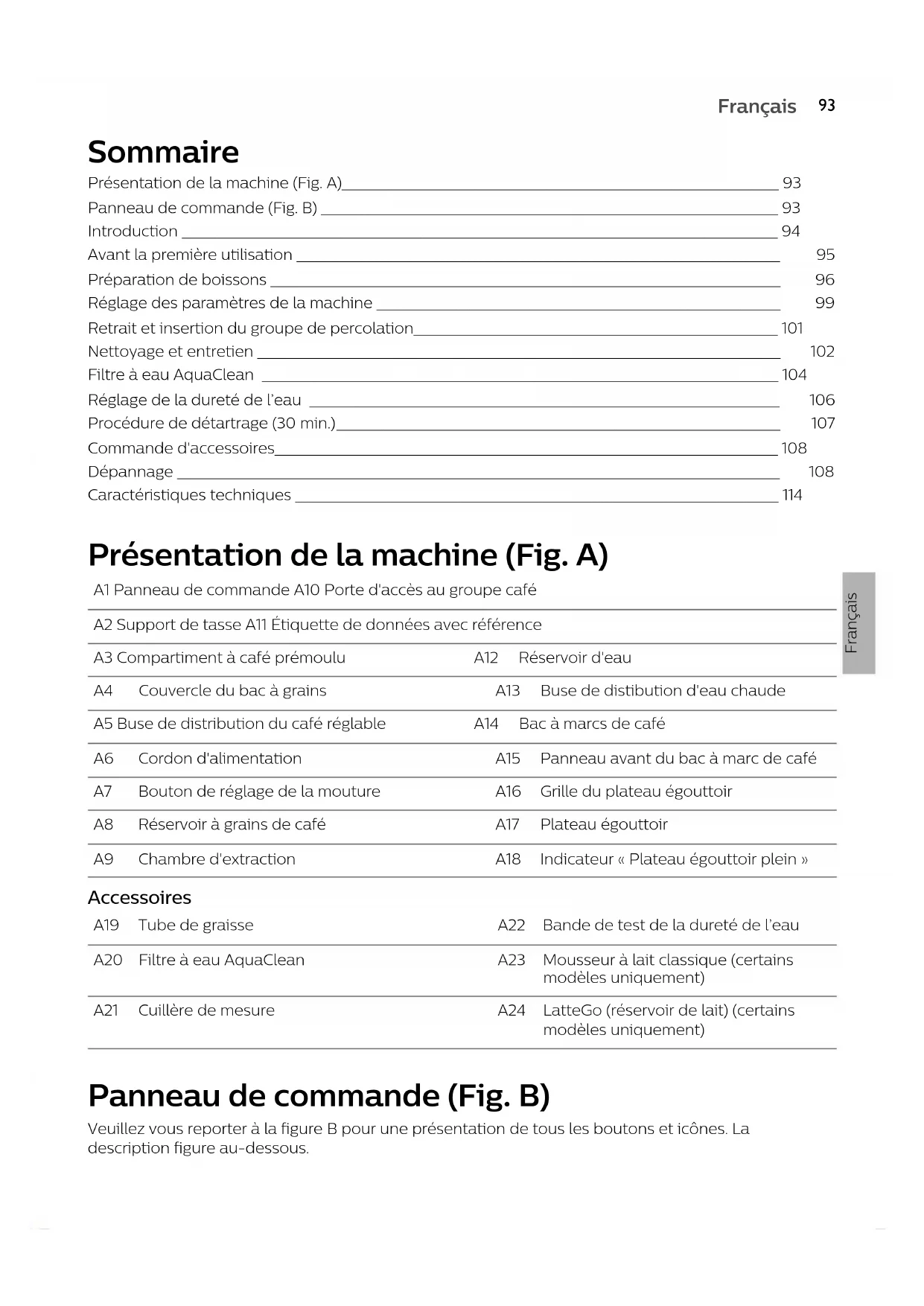 Français Français Sommaire Présentation de la machine (Fig. A)__________________________________________________________________ 93 Panneau de commande (Fig. B) _____________________________________________________________________ 93 Introduction __________________________________________________________________________________________ 94 Avant la première utilisation _________________________________________________________________________ 95 Préparation de boissons _____________________________________________________________________________ 96 Réglage des paramètres de la machine _____________________________________________________________ 99 Retrait et insertion du groupe de percolation_______________________________________________________ 101 Nettoyage et entretien _______________________________________________________________________________ 102 Filtre à eau AquaClean ______________________________________________________________________________ 104 Réglage de la dureté de l’eau _______________________________________________________________________ 106 Procédure de détartrage (30min.)___________________________________________________________________ 107 Commande d'accessoires____________________________________________________________________________ 108 Dépannage ___________________________________________________________________________________________ 108 Caractéristiques techniques _________________________________________________________________________ 114 Présentation de la machine (Fig. A) A1 Panneau de commande A10 Porte d'accès au groupe café A2 Support de tasse A11 Étiquette de données avec référence A3 Compartiment à café prémoulu A12 Réservoir d'eau A4 Couvercle du bac à grains A13 Buse de distibution d'eau chaude A5 Buse de distribution du café réglable A14 Bac à marcs de café A6 Cordon d'alimentation A15 Panneau avant du bac à marc de café A7 Bouton de réglage de la mouture A16 Grille du plateau égouttoir A8 Réservoir à grains de café A17 Plateau égouttoir A9 Chambre d'extraction A18 Indicateur «Plateau égouttoir plein» Accessoires A19 Tube de graisse A22 Bande de test de la dureté de l’eau A20 Filtre à eau AquaClean A23 Mousseur à laitclassique (certains modèles uniquement) A21 Cuillère de mesure A24 LatteGo (réservoir de lait) (certains modèles uniquement) Panneau de commande (Fig. B) Veuillez vous reporter à la figureB pour une présentation de tous les boutons et icônes. La description figure au-dessous.94 Français Certains boutons et icônes sont présents sur certains modèles uniquement. B1 Bouton marche/arrêt B7 Icônes d’alerte B2 Icônes de boissons * B8 Voyant de démarrage B3 Icône de l’intensité d’arôme/de mouture du café B9 Marche/arrêt (bouton) B4 Icône de la quantité de boisson B10 Icône Calc/Clean B5 Icône de la quantité de lait (certains modèles uniquement) B11 Icône AquaClean B6 Icône de la température du café (certains modèles uniquement)
