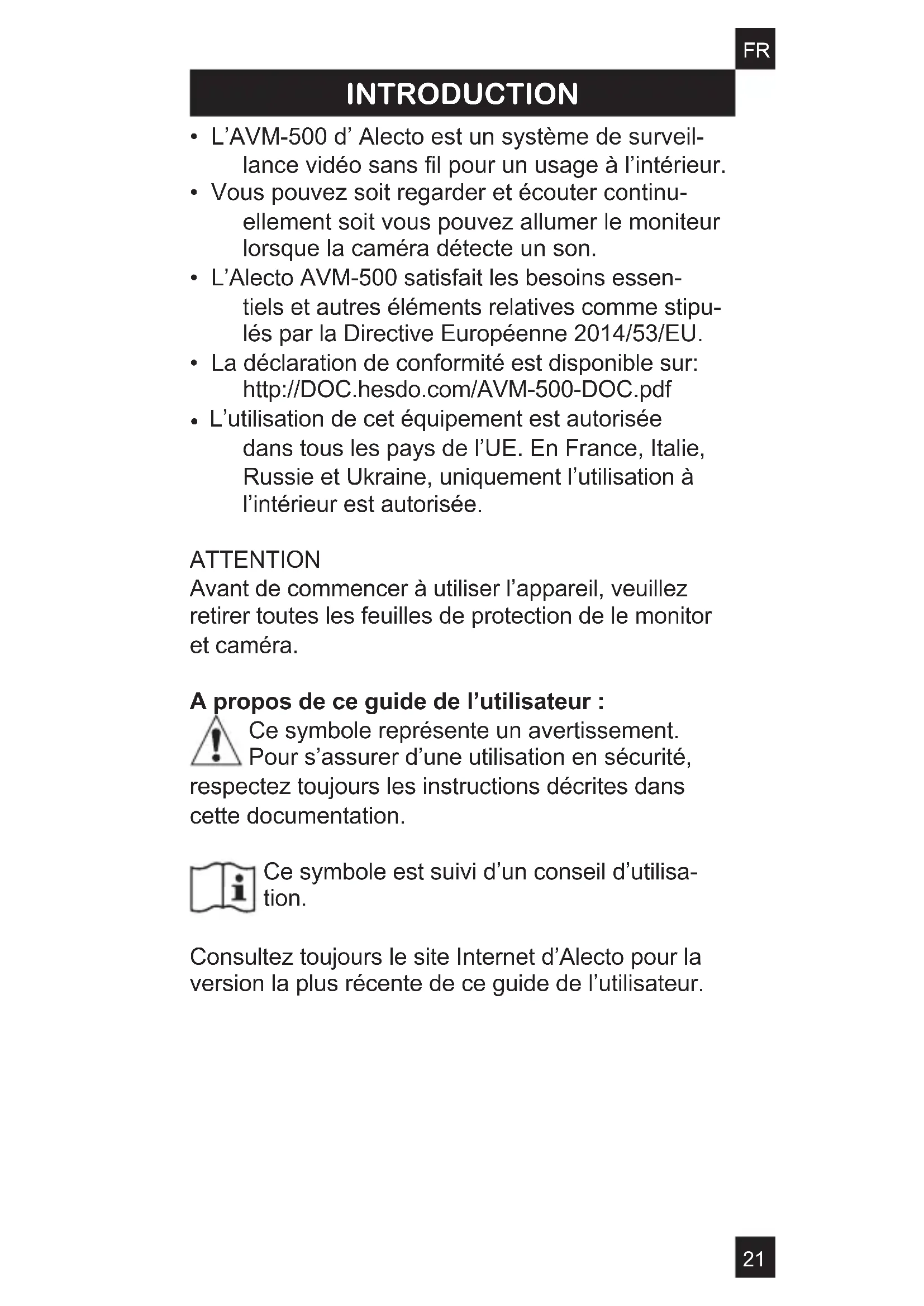 - L’utilisation de cet équipement est autorisée dans tous les pays de l’UE. En France, Italie, Russie et Ukraine, uniquement l’utilisation à l’intérieur est autorisée. ATTENTION Avant de commencer à utiliser l’appareil, veuillez retirer toutes les feuilles de protection de le monitor et caméra. A propos de ce guide de l’utilisateur : Ce symbole représente un avertissement. Pour s’assurer d’une utilisation en sécurité, respectez toujours les instructions décrites dans cette documentation. Ce symbole est suivi d’un conseil d’utilisa- tion. Consultez toujours le site Internet d’Alecto pour la version la plus récente de ce guide de l’utilisateur.22