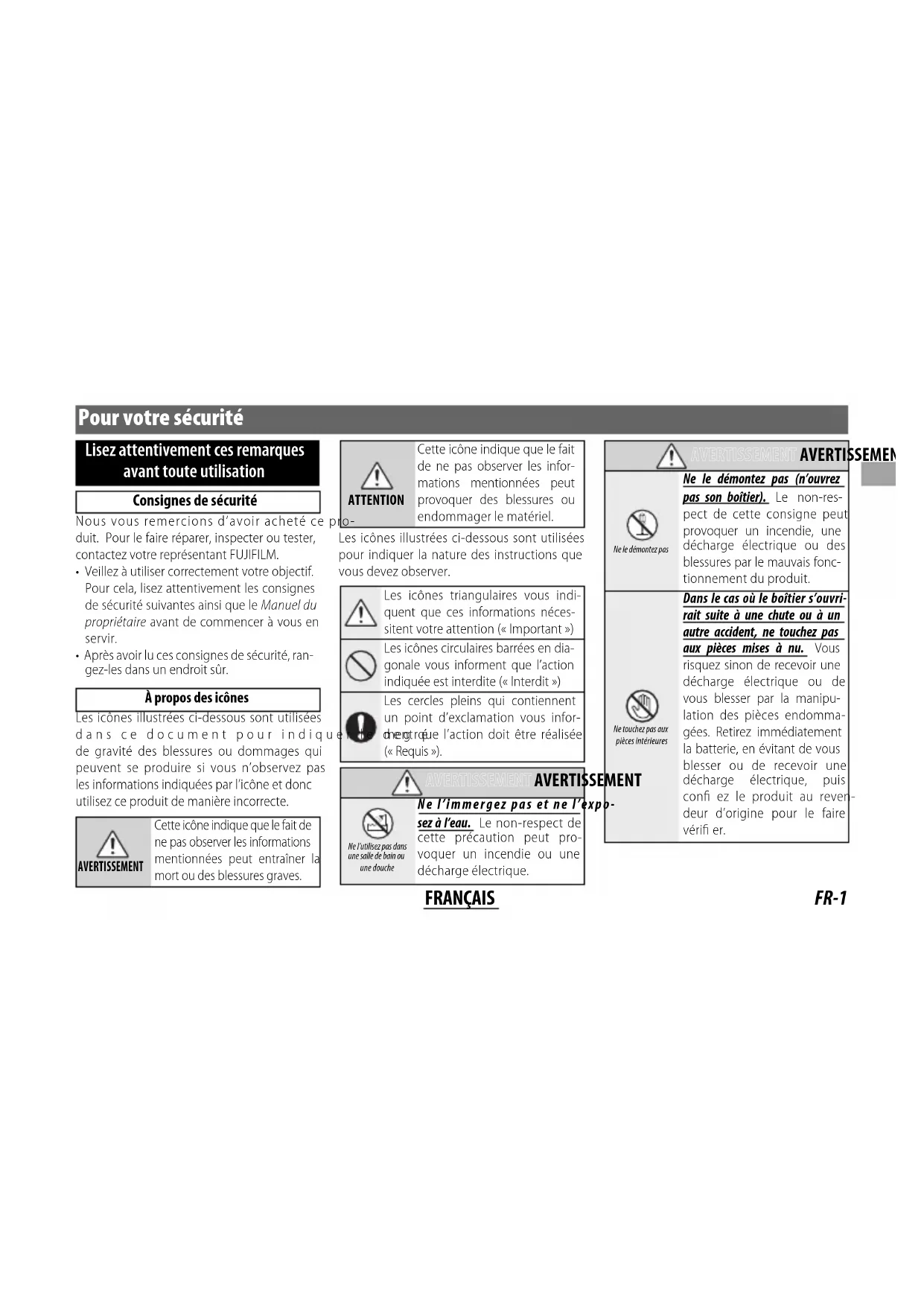 - distance from camera lens mount ange ⌀73.2 × 69.7 mm ⌀75.0 × 105.0 mm Weight* (approx.) * excluding caps and hoods 405 g 540 g Filter size ⌀62 mm ⌀62 mm Q Improvements may result in unannounced changes to specifi cations and appearance. Q Owing to how this lens is constructed, the “Distance indicator” displayed by the camera may in some cases diff er from the actual focus distance. Use the “Distance indicator” as a guide only.FR-1 FRANÇAIS Pour votre sécurité Lisez attentivement ces remarques avant toute utilisation Consignes de sécurité Nous vous remercions d’avoir acheté ce pro-duit. Pour le faire réparer, inspecter ou tester, contactez votre représentant FUJIFILM.• Veillez à utiliser correctement votre objectif. Pour cela, lisez attentivement les consignes de sécurité suivantes ainsi que le Manuel du propriétaire avant de commencer à vous en servir.• Après avoir lu ces consignes de sécurité, ran-gez-les dans un endroit sûr. À propos des icônes Les icônes illustrées ci-dessous sont utilisées dans ce document pour indiquer le degré de gravité des blessures ou dommages qui peuvent se produire si vous n’observez pas les informations indiquées par l’icône et donc utilisez ce produit de manière incorrecte.AVERTISSEMENTCette icône indique que le fait de ne pas observer les informations mentionnées peut entraîner la mort ou des blessures graves.ATTENTIONCette icône indique que le fait de ne pas observer les infor-mations mentionnées peut provoquer des blessures ou endommager le matériel.Les icônes illustrées ci-dessous sont utilisées pour indiquer la nature des instructions que vous devez observer.Les icônes triangulaires vous indi-quent que ces informations néces-sitent votre attention (« Important »)Les icônes circulaires barrées en dia-gonale vous informent que l’action indiquée est interdite (« Interdit »)Les cercles pleins qui contiennent un point d’exclamation vous infor-ment que l’action doit être réalisée (« Requis »). AVERTISSEMENT AVERTISSEMENT Ne l’utilisez pas dans une salle de bain ou une doucheNe l’immergez pas et ne l’expo-sez à l’eau. Le non-respect de cette précaution peut pro-voquer un incendie ou une décharge électrique. AVERTISSEMENT AVERTISSEMENT Ne le démontez pasNe le démontez pas (n’ouvrez pas son boîtier). Le non-res-pect de cette consigne peut provoquer un incendie, une décharge électrique ou des blessures par le mauvais fonc-tionnement du produit.Ne touchez pas aux pièces intérieuresDans le cas où le boîtier s’ouvri-rait suite à une chute ou à un autre accident, ne touchez pas aux pièces mises à nu. Vous risquez sinon de recevoir une décharge électrique ou de vous blesser par la manipu-lation des pièces endomma-gées. Retirez immédiatement la batterie, en évitant de vous blesser ou de recevoir une décharge électrique, puis confi ez le produit au reven-deur d’origine pour le faire vérifi er.FR-2 FRANÇAIS AVERTISSEMENT AVERTISSEMENT Ne le placez pas sur des surfaces instables. Il risque de tomber et de blesser quelqu’un. Ne regardez pas le soleil à travers l’objectif ou le viseur de l’appareil photo. Le non- respect de cette précaution pourrait entraîner une défi - cience visuelle permanente. ATTENTION ATTENTION Ne l’utilisez pas et ne le rangez pas dans des lieux exposés à la vapeur, à la fumée ou qui sont très humides ou poussiéreux. Le non-respect de cette consigne peut provoquer un incendie ou une décharge électrique Ne le laissez pas en plein soleil ou dans des endroits exposés à des températures très élevées, comme dans un véhicule fermé par grand soleil. Le non-res- pect de cette consigne peut provoquer un incendie ATTENTION ATTENTION Conservez-le hors de la portée des enfants en bas âge. Il peut provoquer des blessures s’il est laissé dans les mains d’un enfant. Ne le manipulez pas avec des mains mouillées. Vous risquez sinon de recevoir un choc électrique. Lorsque vous photographiez un sujet à contre-jour, gardez le soleil à l’extérieur du cadre. Les rayons du soleil focalisés dans l’appareil photo lorsque le so- leil est à l’intérieur ou près du cadre peuvent provoquer des feux ou des brûlures. Remettez les bouchons en place et rangez-le à l’abri du soleil lorsque vous ne l’utilisez pas. Les rayons du soleil focalisés par l’objectif peuvent provo- quer des feux ou des brûlures. ATTENTION ATTENTION Ne transportez pas l’appareil photo ou l’objectif lorsqu’ils sont xés sur un trépied. Ils peuvent tomber ou taper d’autres ob- jets et blesser quelqu’un. À l’attention des clients résidant aux États-UnisÀ l’attention des clients résidant aux États-Unis Testé pour être en conformité avec les normes de la FCC POUR UNE UTILISATION RÉSIDENTIELLE OU DE BUREAU Réglementation de la FCC : Cet appareil est conforme à la