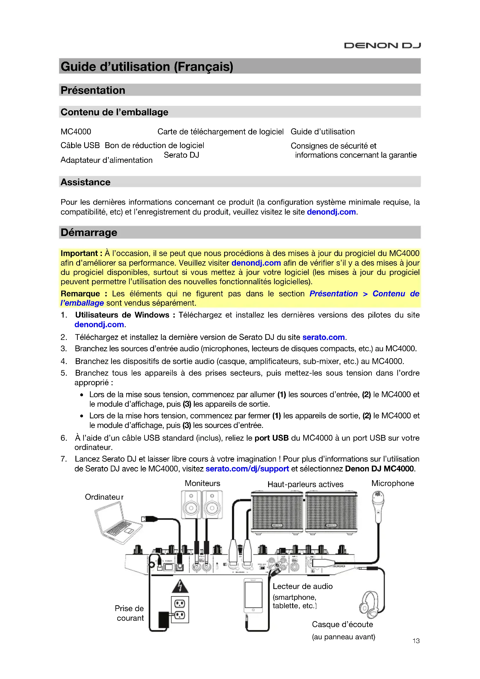 daptateur d’alimentation Assistance Pour les dernières informations concernant ce produit (la configuration système minimale requise, la compatibilité, etc) et l’enregistrement du produit, veuillez visitez le site denondj.com. Démarrage Important : À l’occasion, il se peut que nous procédions à des mises à jour du progiciel du MC4000 afin d’améliorer sa performance. Veuillez visiter denondj.com afin de vérifier s’il y a des mises à jour du progiciel disponibles, surtout si vous mettez à jour votre logiciel (les mises à jour du progiciel peuvent permettre l’utilisation des nouvelles fonctionnalités logicielles). Remarque : Les éléments qui ne figurent pas dans le section Présentation > Contenu de l’emballage sont vendus séparément.