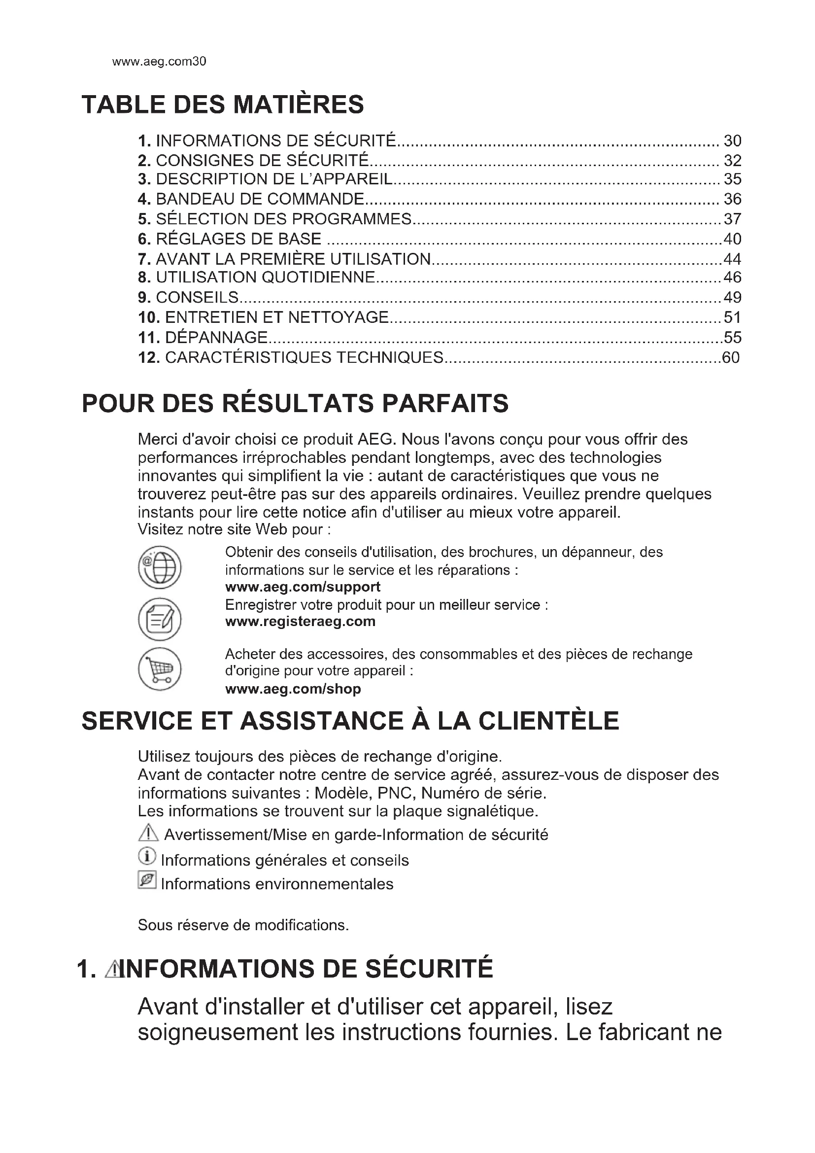 Avant d'installer et d'utiliser cet appareil, lisez soigneusement les instructions fournies. Le fabricant ne www.aeg.com30pourra être tenu pour responsable des blessures et dégâts résultant d'une mauvaise installation ou utilisation. Conservez toujours les instructions dans un lieu sûr et accessible pour vous y référer ultérieurement.