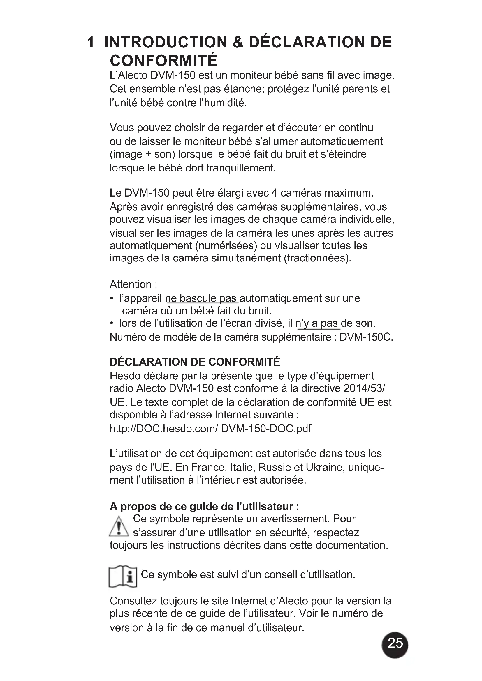 Hesdo déclare par la présente que le type d’équipement radio Alecto DVM-150 est conforme à la directive 2014/53/ UE. Le texte complet de la déclaration de conformité UE est disponible à l’adresse Internet suivante : http://DOC.hesdo.com/ DVM-150-DOC.pdf L’utilisation de cet équipement est autorisée dans tous les pays de l’UE. En France, Italie, Russie et Ukraine, unique- ment l’utilisation à l’intérieur est autorisée. A propos de ce guide de l’utilisateur : Ce symbole représente un avertissement. Pour s’assurer d’une utilisation en sécurité, respectez toujours les instructions décrites dans cette documentation. Ce symbole est suivi d’un conseil d’utilisation. Consultez toujours le site Internet d’Alecto pour la version la plus récente de ce guide de l’utilisateur. Voir le numéro de versionàlandecemanueld’utilisateur.26