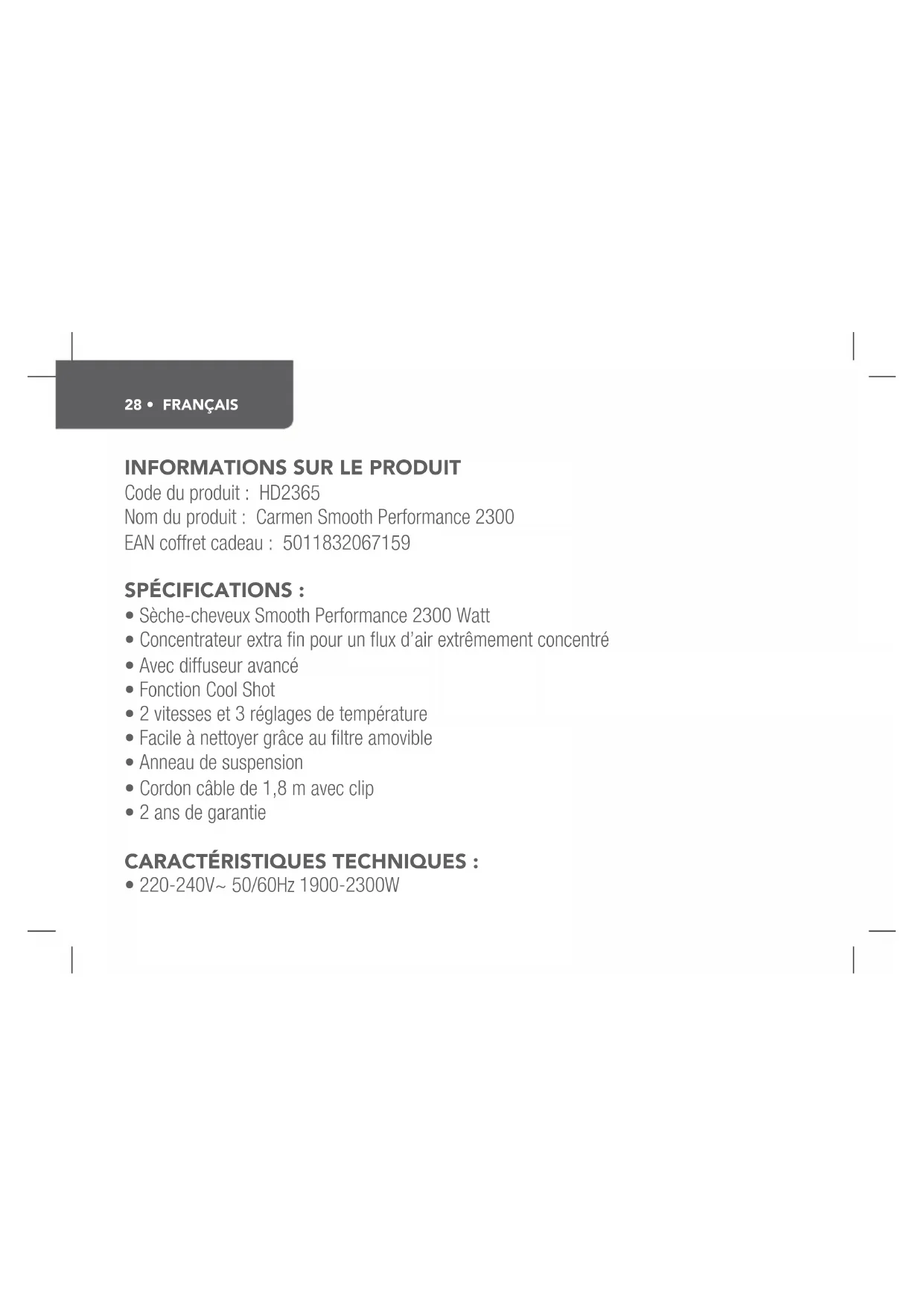 | Caractéristiques techniques | Sèche-cheveux Carmen Smooth Performance 2300 HD2365 |