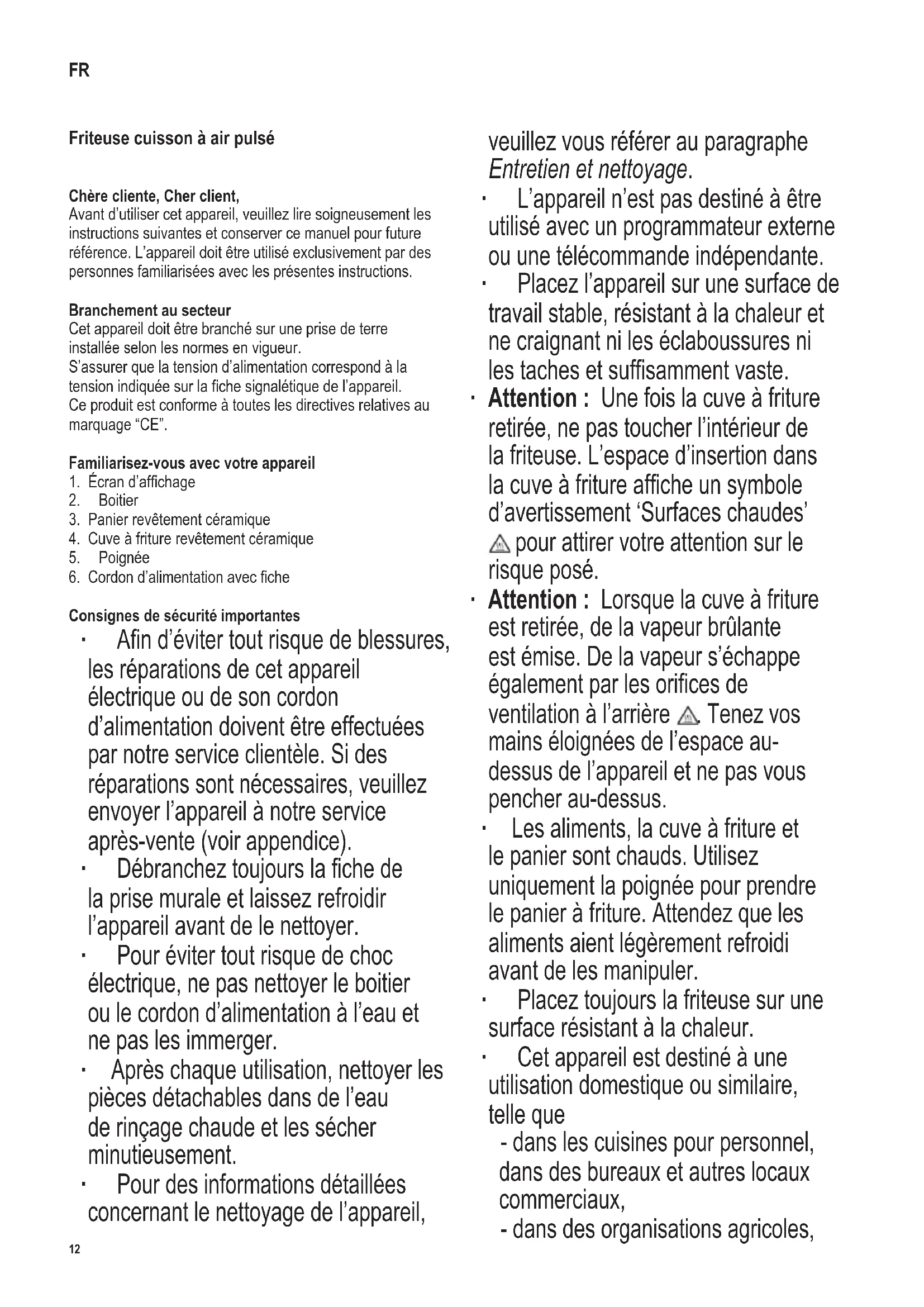 Consignes de sécurité importantes ∙ An d’éviter tout risque de blessures, les réparations de cet appareil électrique ou de son cordon d’alimentation doivent être effectuées par notre service clientèle. Si des réparations sont nécessaires, veuillez envoyer l’appareil à notre service après-vente (voir appendice). ∙ Débranchez toujours la che de la prise murale et laissez refroidir l’appareil avant de le nettoyer. ∙ Pour éviter tout risque de choc électrique, ne pas nettoyer le boitier ou le cordon d’alimentation à l’eau et ne pas les immerger. ∙ Après chaque utilisation, nettoyer les pièces détachables dans de l’eau de rinçage chaude et les sécher minutieusement. ∙ Pour des informations détaillées concernant le nettoyage de l’appareil, veuillez vous référer au paragraphe Entretien et nettoyage. ∙ L’appareil n’est pas destiné à être utilisé avec un programmateur externe ou une télécommande indépendante. ∙ Placez l’appareil sur une surface de travail stable, résistant à la chaleur et ne craignant ni les éclaboussures ni les taches et sufsamment vaste. ∙ Attention : Une fois la cuve à friture retirée, ne pas toucher l’intérieur de la friteuse. L’espace d’insertion dans la cuve à friture afche un symbole d’avertissement ‘Surfaces chaudes’ pour attirer votre attention sur le risque posé. ∙ Attention : Lorsque la cuve à friture est retirée, de la vapeur brûlante est émise. De la vapeur s’échappe également par les orices de ventilation à l’arrière . Tenez vos mains éloignées de l’espace au- dessus de l’appareil et ne pas vous pencher au-dessus. ∙ Les aliments, la cuve à friture et le panier sont chauds. Utilisez uniquement la poignée pour prendre le panier à friture. Attendez que les aliments aient légèrement refroidi avant de les manipuler. ∙ Placez toujours la friteuse sur une surface résistant à la chaleur. ∙ Cet appareil est destiné à une utilisation domestique ou similaire, telle que - dans les cuisines pour personnel, dans des bureaux et autres locaux commerciaux, - dans des organisations agricoles, FR13 142 x 208 mm - par la clientèle dans les hôtels, motels et hébergements similaires, - et dans des maisons d’hôtes. ∙ Cet appareil peut être utilisé par des enfants (à partir de 8 ans) et par des personnes souffrant de déciences physiques, sensorielles ou mentales, ou manquant d’expérience ou de connaissances, s’ils ont été formés à l’utilisation de l’appareil et ont été supervisés, et s’ils en comprennent les dangers et les précautions de sécurité à prendre. ∙ Les enfants ne doivent pas être autorisés à nettoyer ou entretenir l’appareil à moins d’être supervisés et d’avoir plus de 8 ans. ∙ Les enfants ne sont pas autorisés à jouer avec l’appareil. ∙ L’appareil et son cordon d’alimentation doivent être, à tout moment, tenus hors de portée des enfants de moins de 8 ans. ∙ Attention : Tenez les enfants à l’écart des emballages, qui représentent un risque potentiel, par exemple, de suffocation. ∙ Ne laissez pas la friteuse sans surveillance quand elle est en fonctionnement. ∙ Ne pas faire fonctionner la friteuse sans le panier installé dans la cuve. ∙ Avant toute utilisation, vériez soigneusement que l’appareil, son cordon d’alimentation et ses accessoires ne présentent aucun signe de détérioration qui pourrait avoir un effet néfaste sur la sécurité de fonctionnement de l’appareil. Au cas où l’appareil, par exemple, serait tombé sur une surface dure, ou si une force excessive aurait été employée pour tirer sur le cordon d’alimentation, il ne doit plus être utilisé. Dans ce cas, contactez notre Service Clientèle. ∙ Ne mettez pas l’appareil sous des placards muraux ou des objets suspendus, ni directement à côté d’un mur ou dans un coin. ∙ Eviter la présence d’objets ou de matières inammables à proximité de l’appareil. ∙ Attention : Ne pas couvrir les orices de ventilation. ∙ Attention : Ne permettez jamais que l’appareil ou le cordon d’alimentation touche une surface chaude ou entre en contact avec une source de chaleur. Ne laissez pas le cordon d’alimentation pendre librement ; le cordon devra toujours être tenu à l’abri des surfaces brûlantes de l’appareil. ∙ Laissez l’appareil refroidir sufsamment avant de le déplacer. ∙ Débranchez toujours la che de la prise - après utilisation, - en cas de fonctionnement défectueux, - avant de nettoyer l’appareil. ∙ Ne pas débrancher l’appareil en tirant sur le cordon ; tirez toujours sur la che. ∙ Ne pas utiliser d’ustensiles de cuisine en métal pour verser et retirer les denrées, an d’éviter de rayer le revêtement. ∙ Nous déclinons toute responsabilité pour les dommages éventuels subis par cet appareil, résultant d’une utilisation incorrecte ou du non-respect de ce mode d’emploi. Utilisation correcte ∙ Cet appareil est utilisé uniquement pour la cuisson d’aliments. Tout autre type d’utilisation est considéré comme impropre et peut entraîner des dommages corporels ou matériels. ∙ Contrairement aux friteuses conventionnelles, cet appareil ne nécessite pas l’emploi d’huile ou de matières grasses. Avant la première utilisation ∙ Retirez tous les matériaux d’emballage et les étiquettes avant la première utilisation. ∙ Laissez chauffer l’appareil pendant 15 minutes à 200 °C sans aliment. Ceci a pour but d’éliminer l’odeur inhérente à l’appareil. ∙ Assurez une ventilation adéquate en ouvrant fenêtres ou porte-fenêtres. ∙ Nettoyez ensuite l’appareil tel indiqué au paragraphe Entretien et nettoyage. Écran d’afchage Afchage - Cuisson/Air chaud Afchage - Température Afchage - Temps de cuisson restant Touches de sélection - Température/ Augmentation/Réduction du temps de cuisson Touche de sélection - Marche/Arrêt 