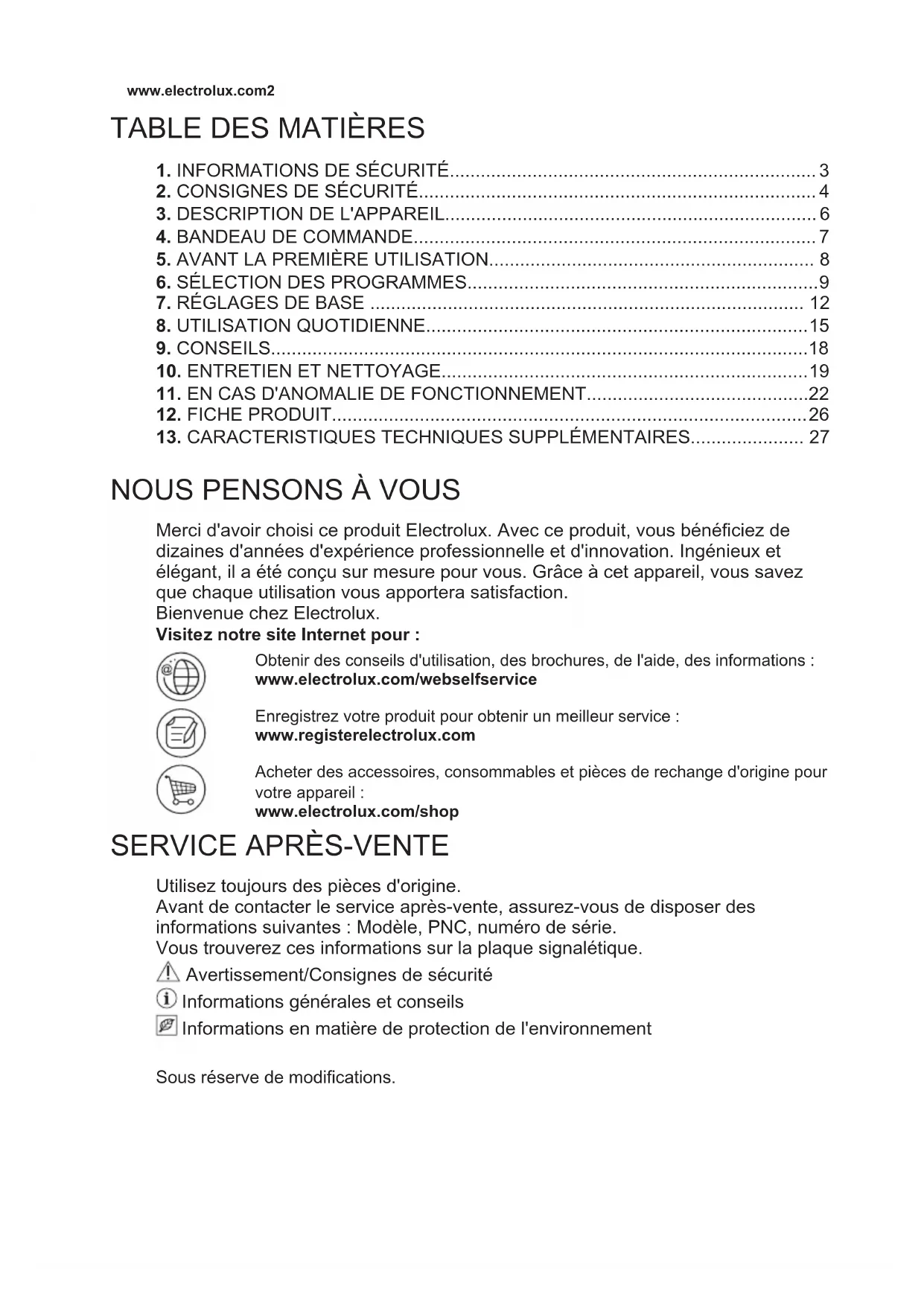 Merci d'avoir choisi ce produit Electrolux. Avec ce produit, vous bénéficiez de dizaines d'années d'expérience professionnelle et d'innovation. Ingénieux et élégant, il a été conçu sur mesure pour vous. Grâce à cet appareil, vous savez que chaque utilisation vous apportera satisfaction. Bienvenue chez Electrolux. Visitez notre site Internet pour : Obtenir des conseils d'utilisation, des brochures, de l'aide, des informations : www.electrolux.com/webselfservice Enregistrez votre produit pour obtenir un meilleur service : www.registerelectrolux.com Acheter des accessoires, consommables et pièces de rechange d'origine pour votre appareil : www.electrolux.com/shop