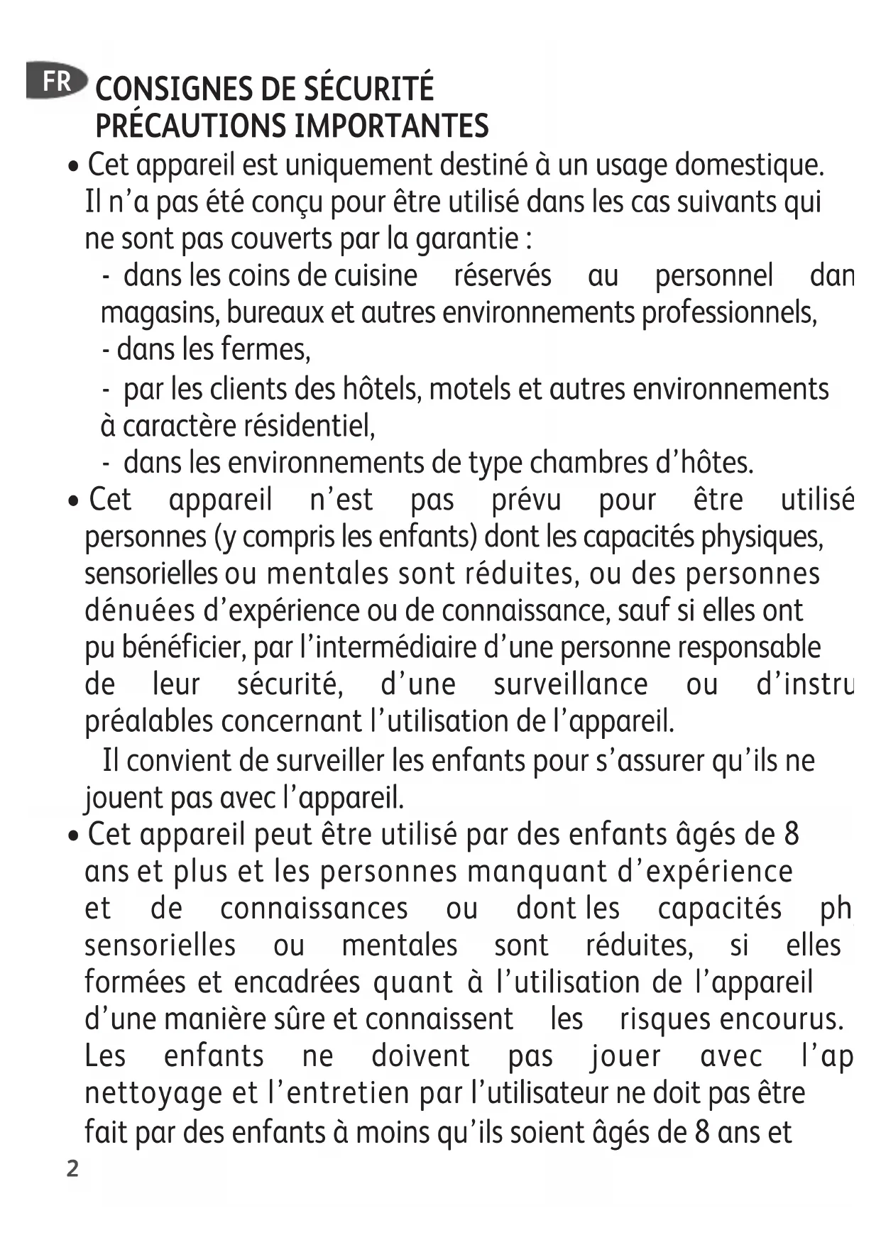 - Cetappareilpeutêtreutilisépardesenfantsâgésde8 ansetplusetlespersonnesmanquantd’expérience et de connaissances ou dontles capacités physiques, sensorielles ou mentales sont réduites, si elles ont été formées et encadrées quant à l’utilisation de l’appareil d’unemanièresûreetconnaissent les risquesencourus. Les enfants ne doivent pas jouer avec l’appareil. Le nettoyageetl’entretienparl’utilisateurnedoitpasêtre faitpardesenfantsàmoinsqu’ilssoientâgésde8anset FR3 plusetsupervisés.Tenirl’appareiletsoncordonhorsdela portéedesenfantsdemoins8ans.
