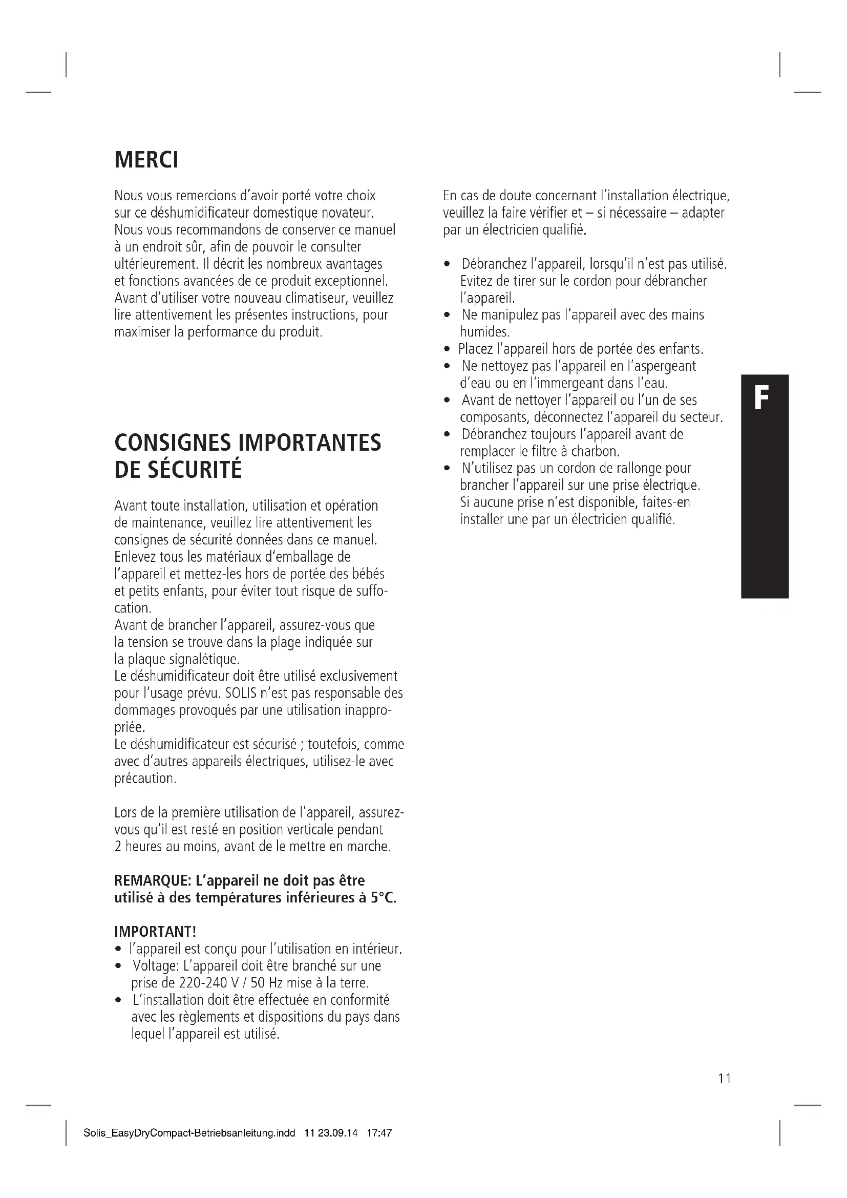 - N’utilisez pas un cordon de rallonge pour brancher l’appareil sur une prise électrique. Si aucune prise n’est disponible, faites-en installer une par un électricien qualifié. MERCI Solis_EasyDryCompact-Betriebsanleitung.indd 11 23.09.14 17:4712
