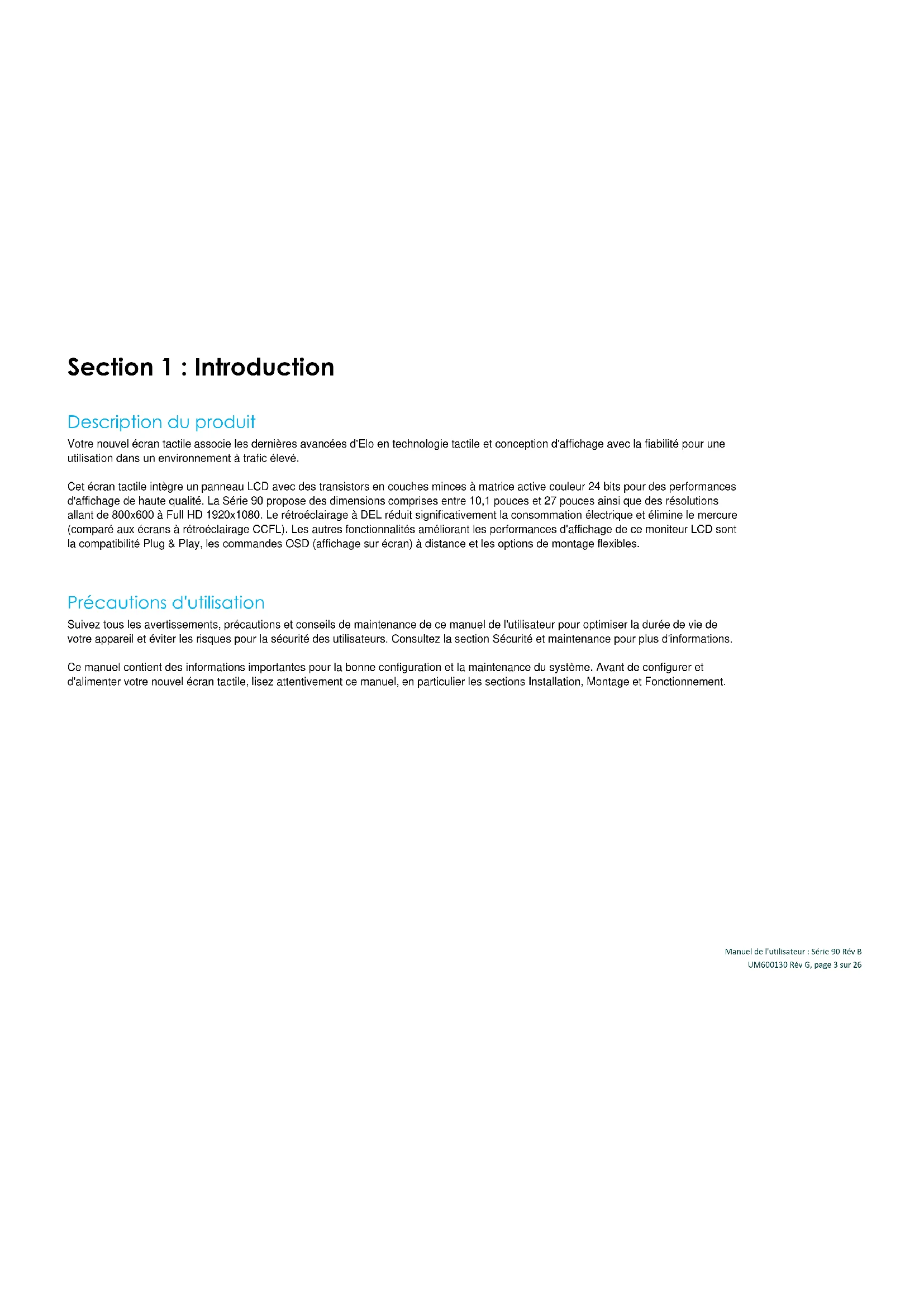 Précautions d'utilisation Suivez tous les avertissements, précautions et conseils de maintenance de ce manuel de l'utilisateur pour optimiser la durée de vie de votre appareil et éviter les risques pour la sécurité des utilisateurs. Consultez la section Sécurité et maintenance pour plus d'informations. Ce manuel contient des informations importantes pour la bonne configuration et la maintenance du système. Avant de configurer et d'alimenter votre nouvel écran tactile, lisez attentivement ce manuel, en particulier les sections Installation, Montage et Fonctionnement.Manuel de l'utilisateur : Série 90 Rév B UM600130 Rév G, page 4 sur 26