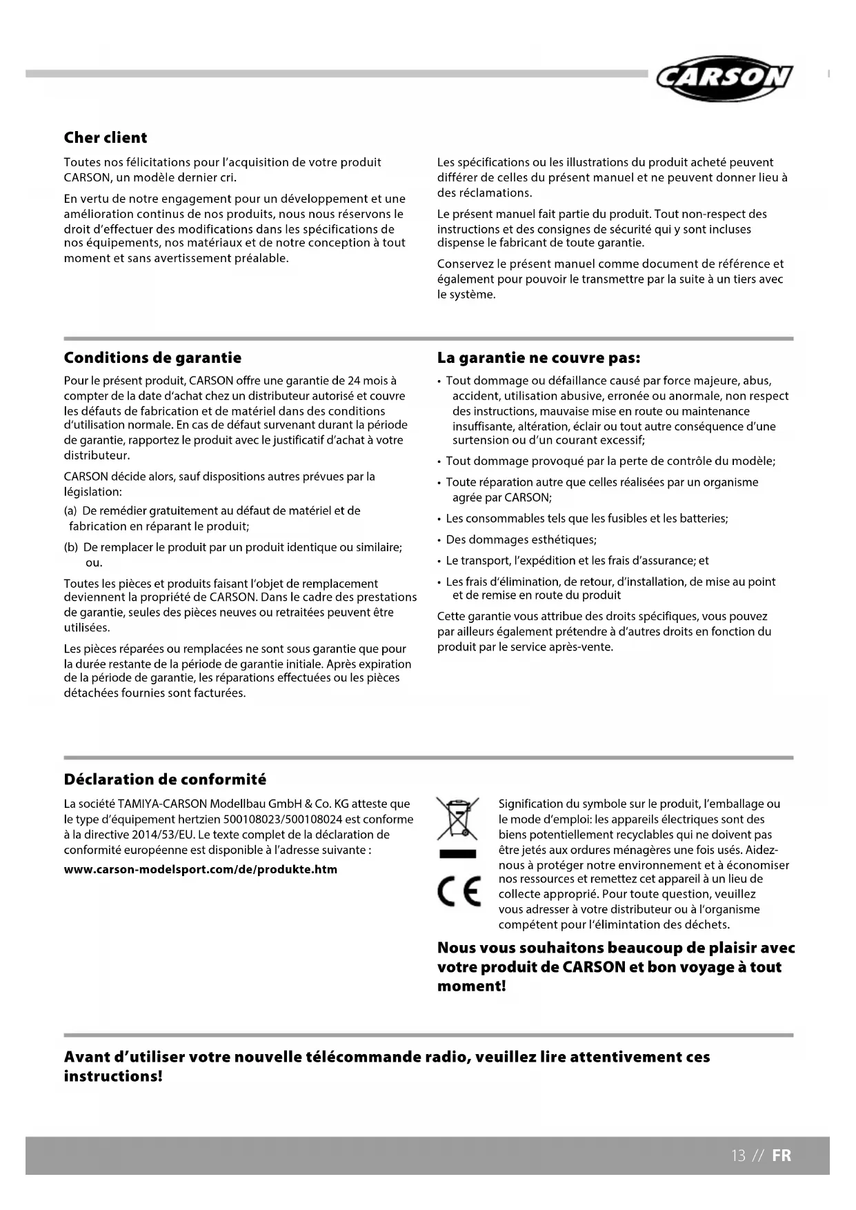 - Les frais d‘élimination, de retour, d’installation, de mise au point et de remise en route du produit Cette garantie vous attribue des droits spécifiques, vous pouvez par ailleurs également prétendre à d’autres droits en fonction du produit par le service après-vente. Avant d’utiliser votre nouvelle télécommande radio, veuillez lire attentivement ces instructions! La société TAMIYA-CARSON Modellbau GmbH & Co. KG atteste que le type d’équipement hertzien 500108023/500108024 est conforme à la directive 2014/53/EU. Le texte complet de la déclaration de conformité européenne est disponible à l’adresse suivante : www.carson-modelsport.com/de/produkte.htm Signification du symbole sur le produit, l’emballage ou le mode d‘emploi: les appareils électriques sont des biens potentiellement recyclables qui ne doivent pas être jetés aux ordures ménagères une fois usés. Aidez- nous à protéger notre environnement et à économiser nos ressources et remettez cet appareil à un lieu de collecte approprié. Pour toute question, veuillez vous adresser à votre distributeur ou à l‘organisme compétent pour l‘élimintation des déchets. Nous vous souhaitons beaucoup de plaisir avec votre produit de CARSON et bon voyage à tout moment! Déclaration de conformitéFR / IT // 14 AVERTISSEMENT DE SÉCURITÉ (INFORMATIONS À CONSERVER!)