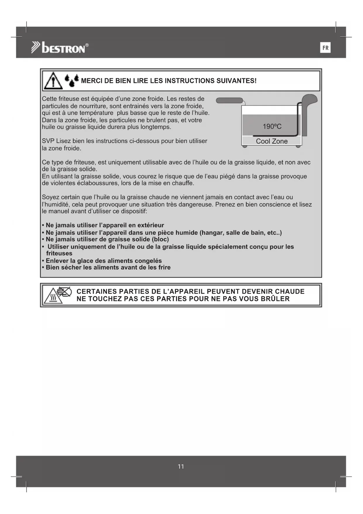 Cette friteuse est équipée d’une zone froide. Les restes de particules de nourriture, sont entrainés vers la zone froide, qui est à une température plus basse que le reste de l’huile. Dans la zone froide, les particules ne brulent pas, et votre huile ou graisse liquide durera plus longtemps. SVP Lisez bien les instructions ci-dessous pour bien utiliser la zone froide. Ce type de friteuse, est uniquement utilisable avec de l’huile ou de la graisse liquide, et non avec de la graisse solide. En utilisant la graisse solide, vous courez le risque que de l’eau piégé dans la graisse provoque de violentes éclaboussures, lors de la mise en chauffe. Soyez certain que l’huile ou la graisse chaude ne viennent jamais en contact avec l’eau ou l’humidité, cela peut provoquer une situation très dangereuse. Prenez en bien conscience et lisez le manuel avant d’utiliser ce dispositif: