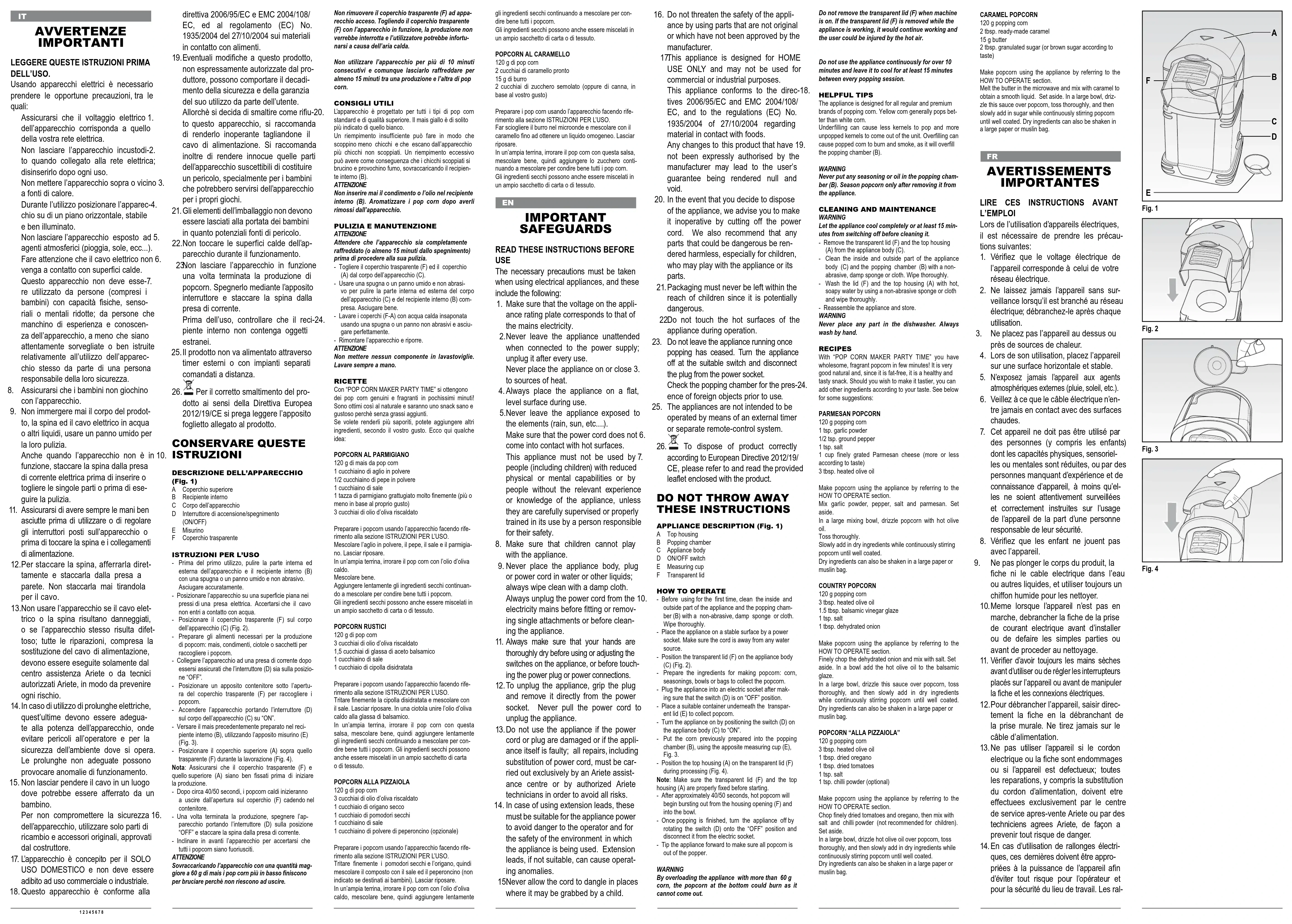 aux termes de la Directive Européenne 2012/19/CE, nous vous prions de lire le feuillet qui accompagne le produit. CONSERVEZ SOIGNEUSEMENT CES INSTRUCTIONS DESCRIPTION DE L’APPAREIL (Fig. 1)A Couvercle supérieurB Récipient interneC Corps de l’appareilD Interrupteur de marche/arrêt (ON/OFF)E MesureurF Couvercle transparentINSTRUCTIONS D’USAGE- Avant la première utilisation, nettoyez la partie interne et externe de l’appareil ainsi que le récipient inter- ne (B) avec une éponge humide et non abrasive. Essuyez soigneusement. - Positionnez l’appareil sur une surface plate près d’une prise électrique. Vérifiez que le câble n’entre pas en contact avec de l’eau.- Positionner le couvercle transparent (F) sur le corps de l’appareil (C) (Fig. 2).- Préparer les aliments nécessaires pour la production de popcorns: maïs, assaisonnement, bols ou sachets pour contenir les popcorn. - Brancher l’appareil à une prise de courant après avoir contrôlé que l’interrupteur (D) soit sur la position “OFF”. - Positionner un récipient sous l’ouverture du couvercle transparent (F) pour récupérer les popcorns. - Allumer l’appareil en plaçant l’interrupteur (D) situ sur le corps de l’appareil (C) sur “ON”. - Verser le maïs préparé à l’avance dans le récipient interne (B), en utilisant le mesureur (E) (Fig. 3).- Positionner le couvercle supérieur (A) sur le couver-cle transparent (F) pendant la cuisson des popcorns (Fig. 4).Note: Vérifiez que le couvercle transparent (F) et celui supérieur (A) soient correctement fixés avant de démar-rer la production. - Au bout de 40/50 secondes environ, les popcorns chauds commencent à sortir de l’ouverture du cou-vercle (F) en tombant dans le récipient. - A la fin de la production, éteignez l’appareil en plaçant l’interrupteur (D) sur “OFF” et débranchez la fiche de la prise de courant. - Inclinez l’appareil en avant pour vérifier que tous les popcorns ont été expulsés.ATTENTION En surchargeant l’appareil avec une quantité de maïs supérieure à 60 g les popcorns qui se trouvent au fond du récipient de l’appareil finissent par brû-ler car ils n’arrivent pas à sortir. N’enlevez pas le couvercle transparent (F) quand l’appareil est allumé. Si on retire le couvercle trans-parent (F) quand l’appareil est allumé, la production est interrompue et l’utilisateur pourrait se blesser à cause de l’air chaud. N’utilisez pas l’appareil pendant plus de 10 minu- tes consécutives et laissez-le refroidir pendant au moins 15 minutes entre une production et l’autre de popcorns.CONSEILS UTILES L’appareil est conçu pour tous les types de popcorns standards et de qualité supérieure. Le maïs jaune est habituellement plus indiqué que le maïs blanc.Si le récipient interne (B) n’est pas suffisamment rempli, il est possible qu’un nombre insuffisant de grains de maïs éclate et que l’appareil par conséquent expulse plus de grains non explosés. Par contre, si on verse une quantité excessive de grains dans le récipient interne (B), il est possible que les grains éclatés brûlent en provoquant de la fumée.ATTENTIONNe versez jamais l’assaisonnement ou l’huile dans le récipient interne (B). Aromatisez les popcorns après les avoir extraits de l’appareil.NETTOYAGE ET ENTRETIENATTENTIONAttendez que l’appareil soit entièrement refroidi (ou attendre au moins 15 minutes après l’arrêt de l’ap-pareil) avant de procéder à son nettoyage.- Retirez le couvercle transparent (F) ainsi que le cou-vercle (A) du corps de l’appareil (C). - Utilisez une éponge ou un chiffon humide et non abrasif pour nettoyer la partie interne et externe du corps de l’appareil (C) et du récipient interne (B). Essuyez correctement.- Lavez les deux couvercles (F-A) avec de l’eau chaude et du produit vaisselle en utilisant une éponge ou un chiffon non abrasifs et essuyez parfaitement.- Remontez l’appareil et rangez-le.ATTENTIONNe lavez aucun composant au lave-vaisselle. Lavez-les toujours à la main.RECETTES Avec “POP CORN MAKER PARTY TIME”, vous pré- parerez des popcorns flagrants en quelques minutes! Ils sont délicieux mangés nature pour un encas sans graisses ajoutées. Si vous voulez les rendre plus savoureux, vous pouvez ajouter d’autres ingrédients selon vos goûts. Nous vous suggérons quelques idées: POPCORNS AU PARMESAN120 g de maïs de popcorns1 cuillère à café d’ail en poudre1/2 cuillère à café de poivre en poudre1 cuillère à café de sel 1 tasse de parmesan râpé très finement (selon vos goûts)3 cuillères à soupe d’huile d’olive réchaufféePréparez les popcorns en utilisant l’appareil selon les indications de la section INSTRUCTIONS D’USAGE.Mélangez l’ail en poudre, le poivre, le sel et le parmesan. Laissez reposez la préparation ainsi obtenue. Dans une grande terrine, baignez les popcorns avec l’huile d’olive réchauffée. Mélangez soigneusement. Ajoutez lentement les ingrédients secs en continuant de mélanger pour bien assaisonner tous les popcorns. Les ingrédients secs peuvent aussi être mélangés dans un grand sac en papier ou en tissu.POPCORNS RUSTIQUES 120 g de popcorns3 cuillères à soupe d’huile d’olive réchauffée1,5 cuillère à soupe de vinaigre balsamique 1 cuillère à café de sel1 cuillère à soupe d’oignon déshydraté Préparez les popcorns en utilisant l’appareil selon les indications de la section INSTRUCTIONS D’USAGE. Hachez finement l’oignon déshydraté et mélangez avec le sel. Laissez reposer. Dans une tasse, unissez l’huile d’olive chaude au vinaigre balsamique. Dans une grande terrine, baignez les popcorns avec cette sauce, mélangez correctement puis ajoutez les ingrédients secs en continuant de mélanger pour assai-sonner parfaitement tous les popcorns. Les ingrédients secs peuvent aussi être mélangés dans un grand sac en papier ou en tissu. POPCORNS A LA PIZZAIOLA 120