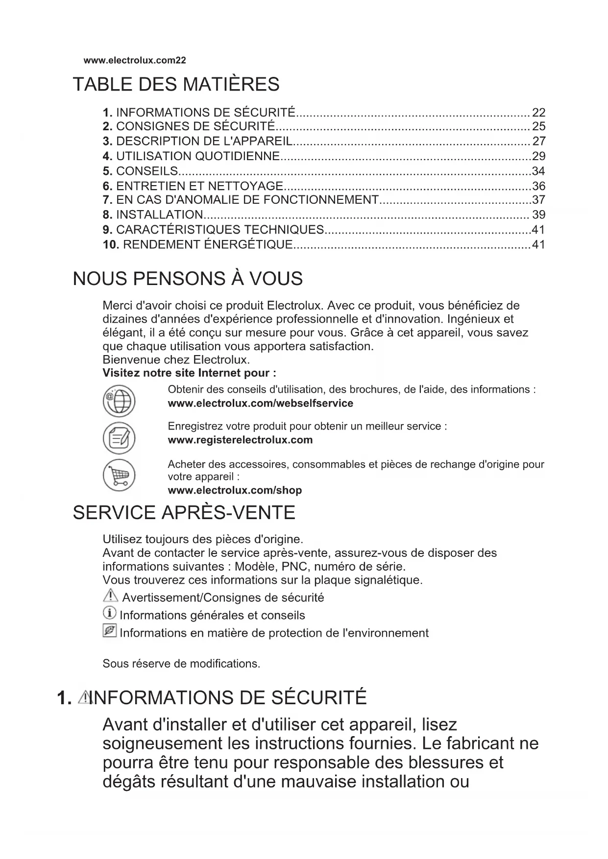 Merci d'avoir choisi ce produit Electrolux. Avec ce produit, vous bénéficiez de dizaines d'années d'expérience professionnelle et d'innovation. Ingénieux et élégant, il a été conçu sur mesure pour vous. Grâce à cet appareil, vous savez que chaque utilisation vous apportera satisfaction. Bienvenue chez Electrolux. Visitez notre site Internet pour : Obtenir des conseils d'utilisation, des brochures, de l'aide, des informations : www.electrolux.com/webselfservice Enregistrez votre produit pour obtenir un meilleur service : www.registerelectrolux.com Acheter des accessoires, consommables et pièces de rechange d'origine pour votre appareil : www.electrolux.com/shop