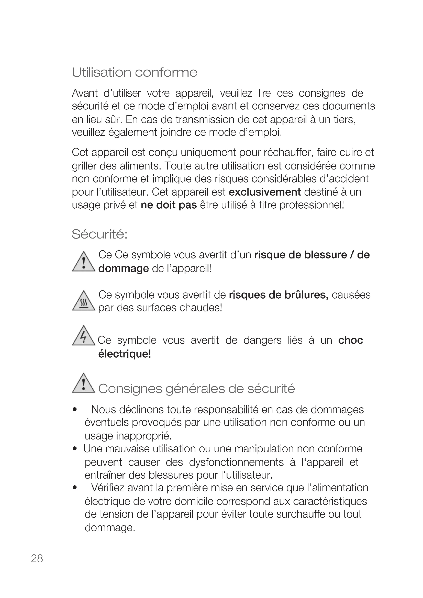 - fordamagescausedbyowner This guarantee does not affect your statutory right, nor any legal right you may have as a costumer under applicable national legislation governing the purchase of goods. Inordertoasserthis/herrightinaguaranteecaseduringthe guaranteed period, the customer must provide evidence of the dateofpurchase(receipt). The guarantee is to be asserted against KORONA electric GmbH, Sundern/Germany. Service Address: KORONA Service Am Steinbach 8 59872 Meschede-Enste Germany Telephone Hotline: 02933 90284-80 Mail: service@korona-electric.de web: www.korona-electric.de within 2 years after the date of purchase. In case of guarantee the customer is given the right to get the appliance repaired at our own or at an authorized shop. Further rights (due to guaranteecase)arenotgiventothecustomer.28 Utilisation conforme Avant d’utiliser votre appareil, veuillez lire ces consignes de sécurité et ce mode d’emploi avant et conservez ces documents en lieu sûr. En cas de transmission de cet appareil à un tiers, veuillez également joindre ce mode d’emploi. Cetappareilestconçuuniquementpourréchauffer,fairecuireet griller des aliments. Toute autre utilisation est considérée comme nonconformeetimpliquedesrisquesconsidérablesd’accident pour l’utilisateur. Cet appareil est exclusivement destiné à un usage privé et ne doit pas être utilisé à titre professionnel! Sécurité: Ce Ce symbole vous avertit d’un risque de blessure / de dommage de l’appareil! Ce symbole vous avertit de risques de brûlures, causées par des surfaces chaudes! Ce symbole vous avertit de dangers liés à un choc électrique! Consignes générales de sécurité