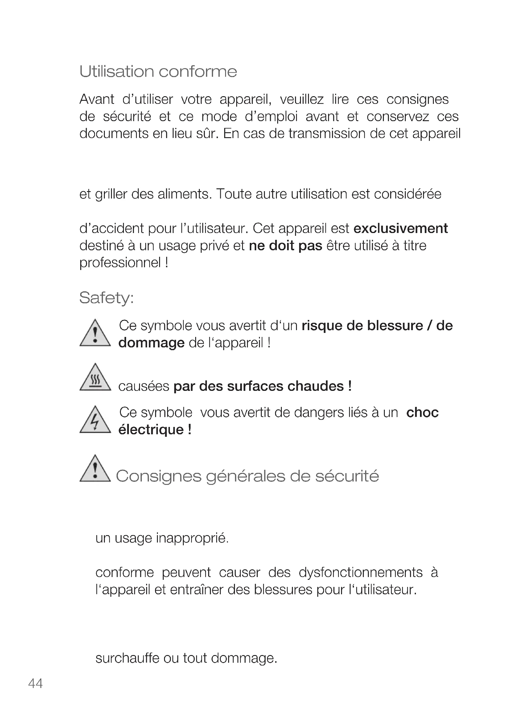 Mise en garde! Pour prévenir toute blessure, toute déterioration de l'appareil, tout chocoléctrique, tout incendie et toute brûlure!