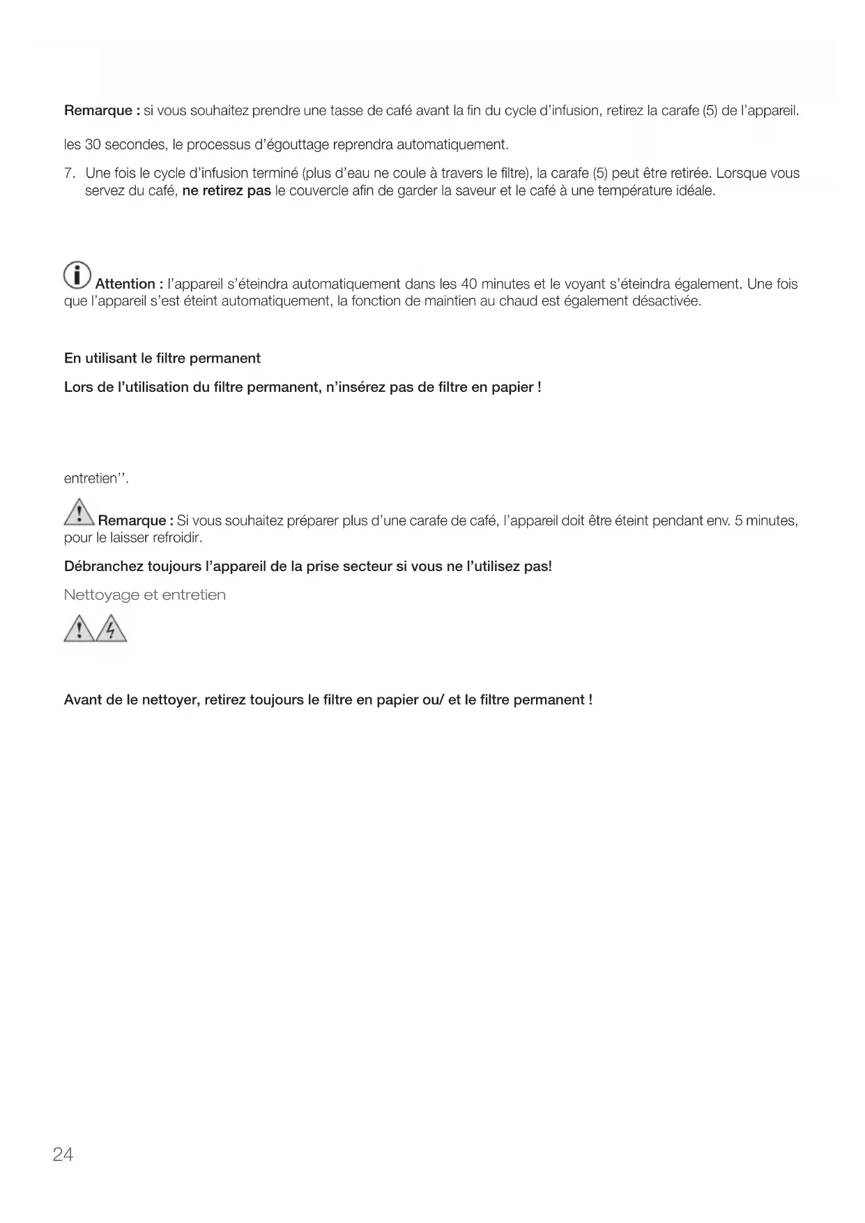 Danger ! Risque de choc électrique ! Avant de le nettoyer, retirez toujours le filtre en papier ou/ et le filtre permanent !