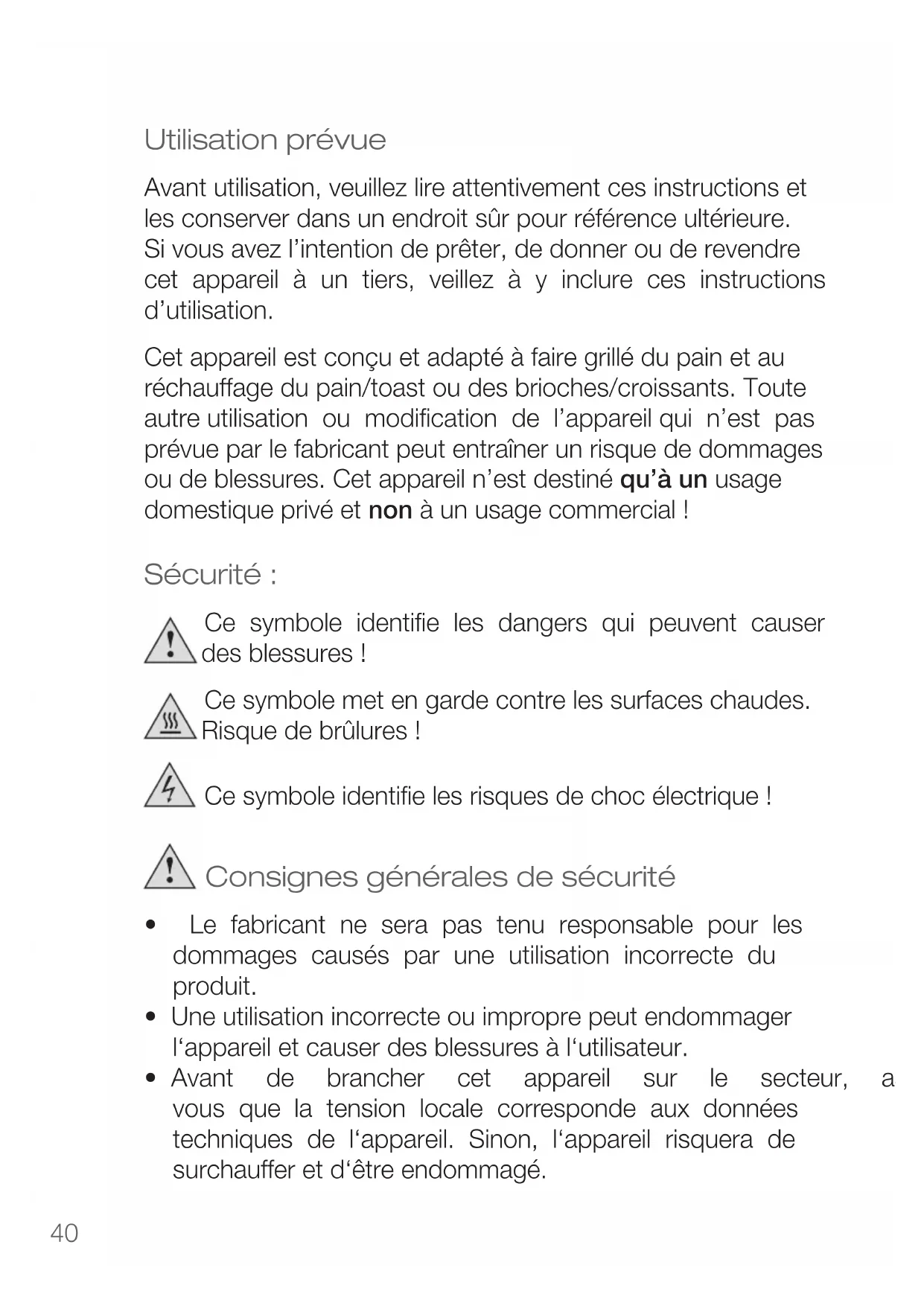 - N’essayez jamais de mettre vos doigts et/ou d’autres objets (p. ex. couteaux, fourchettes) dans les fentes lors de l’utilisation de l’appareil. Cela pourrait conduire à de gravesblessureset/oudommages
