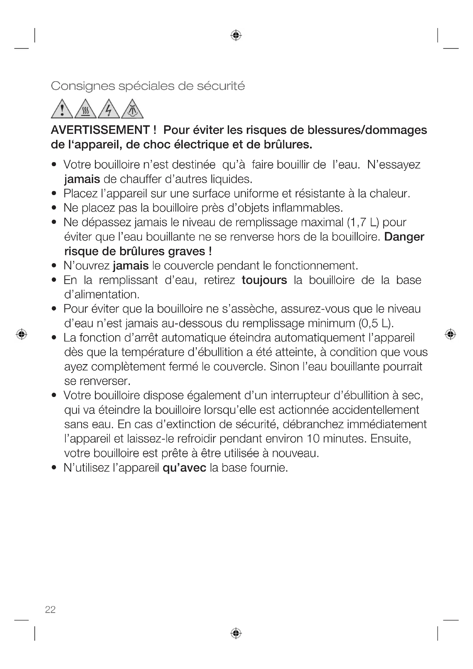 Consignes spéciales de sécurité AVERTISSEMENT ! Pour éviter les risques de blessures/dommages de l‘appareil, de choc électrique et de brûlures.