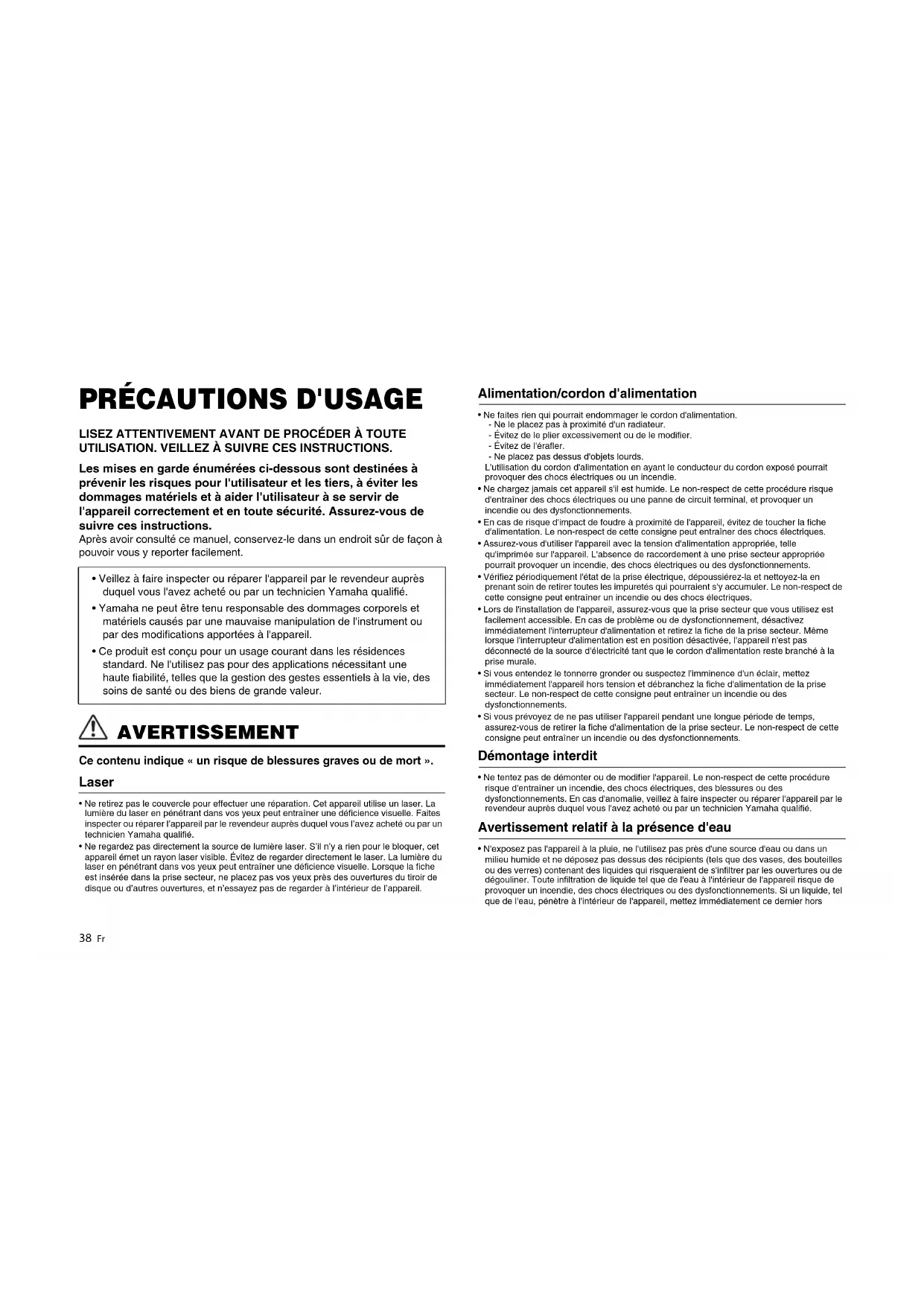 - Ne retirez pas le couvercle pour effectuer une réparation. Cet appareil utilise un laser. La lumière du laser en pénétrant dans vos yeux peut entraîner une déficience visuelle. Faites inspecter ou réparer l’appareil par le revendeur auprès duquel vous l’avez acheté ou par un technicien Yamaha qualifié.• Ne regardez pas directement la source de lumière laser. S’il n’y a rien pour le bloquer, cet appareil émet un rayon laser visible. Évitez de regarder directement le laser. La lumière du laser en pénétrant dans vos yeux peut entraîner une déficience visuelle. Lorsque la fiche est insérée dans la prise secteur, ne placez pas vos yeux près des ouvertures du tiroir de disque ou d’autres ouvertures, et n’essayez pas de regarder à l’intérieur de l’appareil. Alimentation/cordon d'alimentation