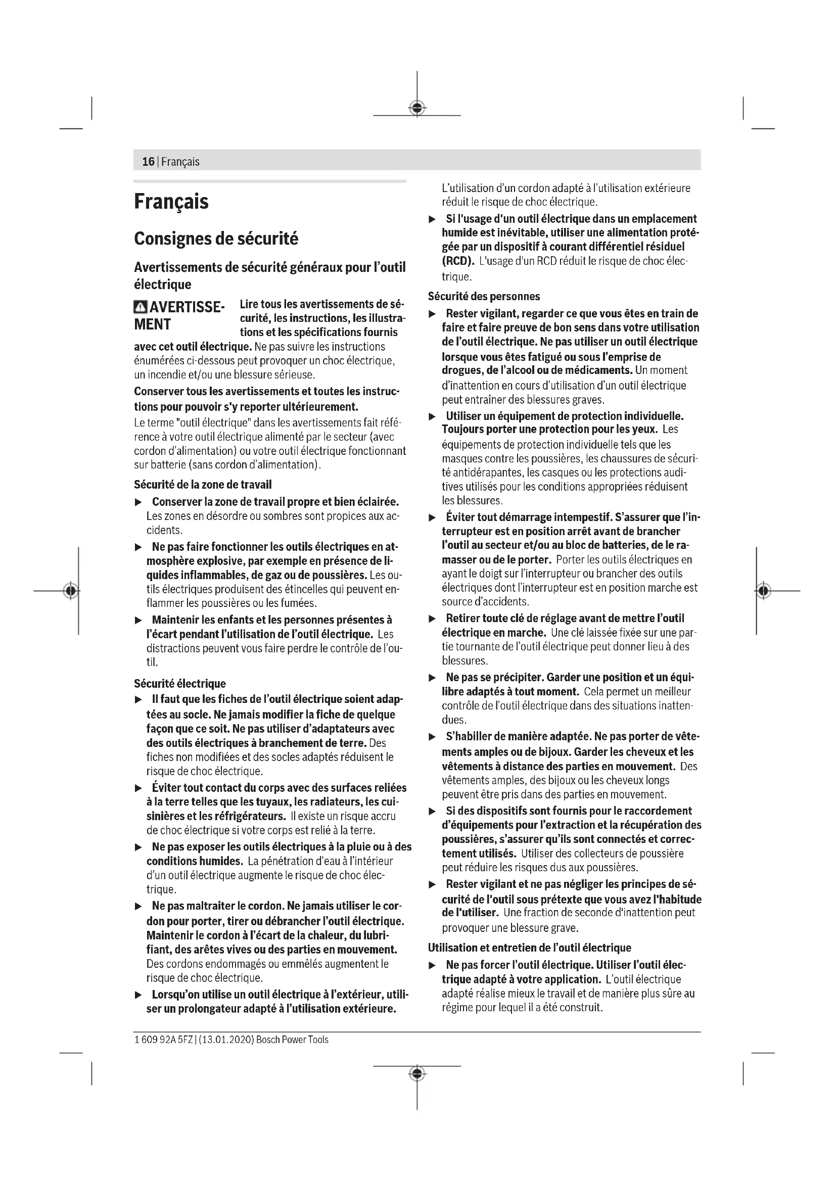 7,0 1,5 7,5 1,5 1 609 92A 5FZ | (13.01.2020) Bosch Power ToolsFrançais | 19 Le niveau de vibration et la valeur d’émission sonore indi- qués dans cette notice d’utilisation ont été mesurés confor- mément à la norme et peuvent être utilisés pour une compa- raison entre les outils électroportatifs. Ils peuvent aussi ser- vir de base à une estimation préliminaire du taux de vibration et du niveau sonore. Le niveau de vibration et la valeur d’émission sonore indi- qués s’appliquent pour les utilisations principales de l’outil électroportatif. Si l’outil électroportatif est utilisé pour d’autres applications, avec d’autres accessoires de travail ou sans avoir fait l’objet d’un entretien régulier, le niveau de vi- bration et la valeur d’émission sonore peuvent différer. Il peut en résulter des vibrations et un niveau sonore nette- ment plus élevés pendant toute la durée de travail. Pour une estimation précise du niveau de vibration et du ni- veau sonore, il faut aussi prendre en considération les pé- riodes pendant lesquelles l’outil est éteint ou bien en marche sans être vraiment en action. Il peut en résulter au final un ni- veau de vibration et un niveau sonore nettement plus faibles pendant toute la durée de travail. Prévoyez des mesures de protection supplémentaires per- mettant de protéger l’utilisateur de l’effet des vibrations, par exemple: maintenance de l’outil électroportatif et des acces- soires de travail, maintien des mains au chaud, organisation des procédures de travail. Montage u Débranchez le câble d’alimentation de la prise avant d’effectuer des travaux quels qu’il soient sur l’outil électroportatif. Changement de disque abrasif Pour enlever le disque abrasif (8), soulevez-le par le côté et retirez-le du plateau de ponçage (11). Avant de monter un nouveau disque abrasif, enlevez les poussières et saletés qui se trouvent sur le plateau de pon- çage (11) avec par ex. un pinceau. Le plateau de ponçage (11) est doté d’un revêtement auto- agrippant permettant de fixer rapidement et facilement les disques abrasifs auto-agrippants. Appliquez fermement le disque abrasif (8) sur le plateau de ponçage (11). Afin de garantir une bonne aspiration des poussières, assu- rez-vous que les perforations du disque abrasif (8) et du pla- teau de ponçage (11) coïncident. Choix du plateau de ponçage Il est possible de monter sur l’outil électroportatif des pla- teaux de ponçage de différentes duretés, selon l’application envisagée : – Plateau de ponçage extra souple : pour le polissage et le ponçage de précision, également sur les surfaces bom- bées. – Plateau de ponçage souple : pour tous les travaux de pon- çage, usage universel. – Plateau de ponçage dur : pour disposer d’une grande ca- pacité d’enlèvement lors du ponçage de surfaces planes. Changement du plateau de ponçage Remarque : Remplacez immédiatement un plateau de pon- çage (11) endommagé. Retirez le disque abrasif ou l’outil de polissage. Dévissez la vis (10) complètement et retirez le plateau de ponçage (11). Mettez en place le nouveau plateau de ponçage (11) et resserrez fermement la vis. Note: Les dentures sont différentes pour les plaquettes de Ø150 et de Ø125. Les plaquettes ne peuvent être montées que sur l'outil électroportatif approprié. Remarque : Lors de la mise en place du plateau de ponçage, veillez à ce que la denture du dispositif d’entraînement s’en- gage dans les évidements du plateau de ponçage. Remarque : Confiez impérativement le remplacement d’un porte-plateau de ponçage endommagé à un centre SAV pour outillage électroportatif Bosch agréé. Aspiration de poussières/de copeaux Les poussières de matériaux tels que peintures contenant du plomb, certains bois, minéraux ou métaux, peuvent être nui- sibles à la santé. Le contact avec les poussières ou leur inha- lation peut entraîner des réactions allergiques et/ou des ma- ladies respiratoires auprès de l’utilisateur ou des personnes se trouvant à proximité. Certaines poussières telles que les poussières de chêne ou de hêtre sont considérées comme cancérigènes, surtout en association avec des additifs pour le traitement du bois (chromate, lasure). Les matériaux contenant de l’amiante ne doivent être travaillés que par des personnes qualifiées. – Si possible, utilisez un dispositif d’aspiration des pous- sières approprié au matériau. – Veillez à bien aérer la zone de travail. – Il est recommandé de porter un masque respiratoire avec un niveau de filtration de classe P2. Respectez les règlements spécifiques aux matériaux à traiter en vigueur dans votre pays. u Évitez toute accumulation de poussières sur le lieu de travail. Les poussières peuvent facilement s’enflammer. Lors du ponçage, il est recommandé de raccorder l'outil électroportatif à un aspirateur. L'outil électroportatif n'est pas équipé de son propre système d'aspiration. Il n'est pas possible d'utiliser un sac à poussières. Aspiration au moyen d’un aspirateur Raccordez le tuyau d'aspiration (accessoire) au souffleur (3) ou directement à la tubulure d'aspiration (4) de l'outil élec- troportatif. Remarque: La tubulure d’aspiration (3) est en matériau an- tistatique. L’utilisation supplémentaire d’un tuyau d’aspira- tion antistatique (accessoire) prévient toute accumulation de charges électrostatiques sur l’outil (possible lors de cer- tains types de ponçages). En cas de travail sans aspiration de poussières (p.ex. le po- lissage), vous pouvez retirer le souffleur (3). Pour ce faire, Bosch Power Tools 1 609 92A 5FZ | (13.01.2020)20 | Français appuyez sur le bouton de déverrouillage (15) et retirez le souffleur (3) de l'outil électroportatif en le tirant vers le haut. L’aspirateur doit être conçu pour le type de matériau à pon- cer. Pour l’aspiration de poussières part