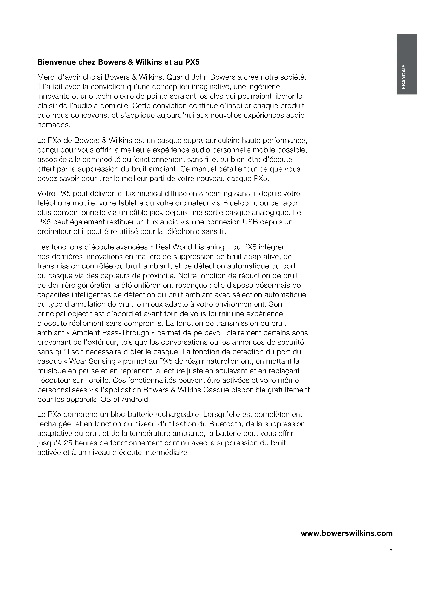 ENGLISH Specications Wearing Style Bluetooth Wireless On-Ear Headphones Technical Features Adaptive Noise Cancellation Ambient Pass-Through Wear-Detection Sensor Bluetooth® audio - Bluetooth 5.0 with aptX™ Adaptive USB-C charging & audio interface 3.5mm auxiliary audio interface Bluetooth Codecs aptX™ Adaptive aptX™ HD aptX™ Classic AAC SBC Bluetooth Proles A2DP v1.3.1 AVRCP v1.6.1 HFP v1.7.1 HSP v1.2 BLE GATT (Generic Attribute Prole) Drive Units 2 x ø 35.6mm full range Microphones 4x mics for ANC 2x mics for telephony (CVC2 – Clear Voice Communication v2) Frequency Range 10Hz to 30kHz Input Impedance 20 kOhms Distortion (THD) <0.3% (1kHz/10mW) Battery Type Rechargeable Lithium Polymer Battery Life & Charging 25 hrs Bluetooth with ANC, 5hrs with 15min charge Inputs Bluetooth, 3.5mm stereo jack, USB-C audio In Box Accessories 1.2m stereo audio cable, 1.2m USB-A to USB-C cable, Storage Case Weight 241 grams9 FRANÇAIS www.bowerswilkins.com Bienvenue chez Bowers & Wilkins et au PX5 Merci d’avoir choisi Bowers & Wilkins. Quand John Bowers a créé notre société, il l’a fait avec la conviction qu’une conception imaginative, une ingénierie innovante et une technologie de pointe seraient les clés qui pourraient libérer le plaisir de l’audio à domicile. Cette conviction continue d’inspirer chaque produit que nous concevons, et s’applique aujourd’hui aux nouvelles expériences audio nomades. Le PX5 de Bowers & Wilkins est un casque supra-auriculaire haute performance, conçu pour vous offrir la meilleure expérience audio personnelle mobile possible, associée à la commodité du fonctionnement sans l et au bien-être d’écoute offert par la suppression du bruit ambiant. Ce manuel détaille tout ce que vous devez savoir pour tirer le meilleur parti de votre nouveau casque PX5. Votre PX5 peut délivrer le ux musical diffusé en streaming sans l depuis votre téléphone mobile, votre tablette ou votre ordinateur via Bluetooth, ou de façon plus conventionnelle via un câble jack depuis une sortie casque analogique. Le PX5 peut également restituer un ux audio via une connexion USB depuis un ordinateur et il peut être utilisé pour la téléphonie sans l. Les fonctions d’écoute avancées « Real World Listening » du PX5 intègrent nos dernières innovations en matière de suppression de bruit adaptative, de transmission contrôlée du bruit ambiant, et de détection automatique du port du casque via des capteurs de proximité. Notre fonction de réduction de bruit de dernière génération a été entièrement reconçue : elle dispose désormais de capacités intelligentes de détection du bruit ambiant avec sélection automatique du type d’annulation de bruit le mieux adapté à votre environnement. Son principal objectif est d’abord et avant tout de vous fournir une expérience d’écoute réellement sans compromis. La fonction de transmission du bruit ambiant « Ambient Pass-Through » permet de percevoir clairement certains sons provenant de l’extérieur, tels que les conversations ou les annonces de sécurité, sans qu’il soit nécessaire d’ôter le casque. La fonction de détection du port du casque « Wear Sensing » permet au PX5 de réagir naturellement, en mettant la musique en pause et en reprenant la lecture juste en soulevant et en replaçant l’écouteur sur l’oreille. Ces fonctionnalités peuvent être activées et voire même personnalisées via l’application Bowers & Wilkins Casque disponible gratuitement pour les appareils iOS et Android. Le PX5 comprend un bloc-batterie rechargeable. Lorsqu’elle est complètement rechargée, et en fonction du niveau d’utilisation du Bluetooth, de la suppression adaptative du bruit et de la température ambiante, la batterie peut vous offrir jusqu’à 25 heures de fonctionnement continu avec la suppression du bruit activée et à un niveau d’écoute intermédiaire. FRANÇAIS Contents FRANÇAIS 1