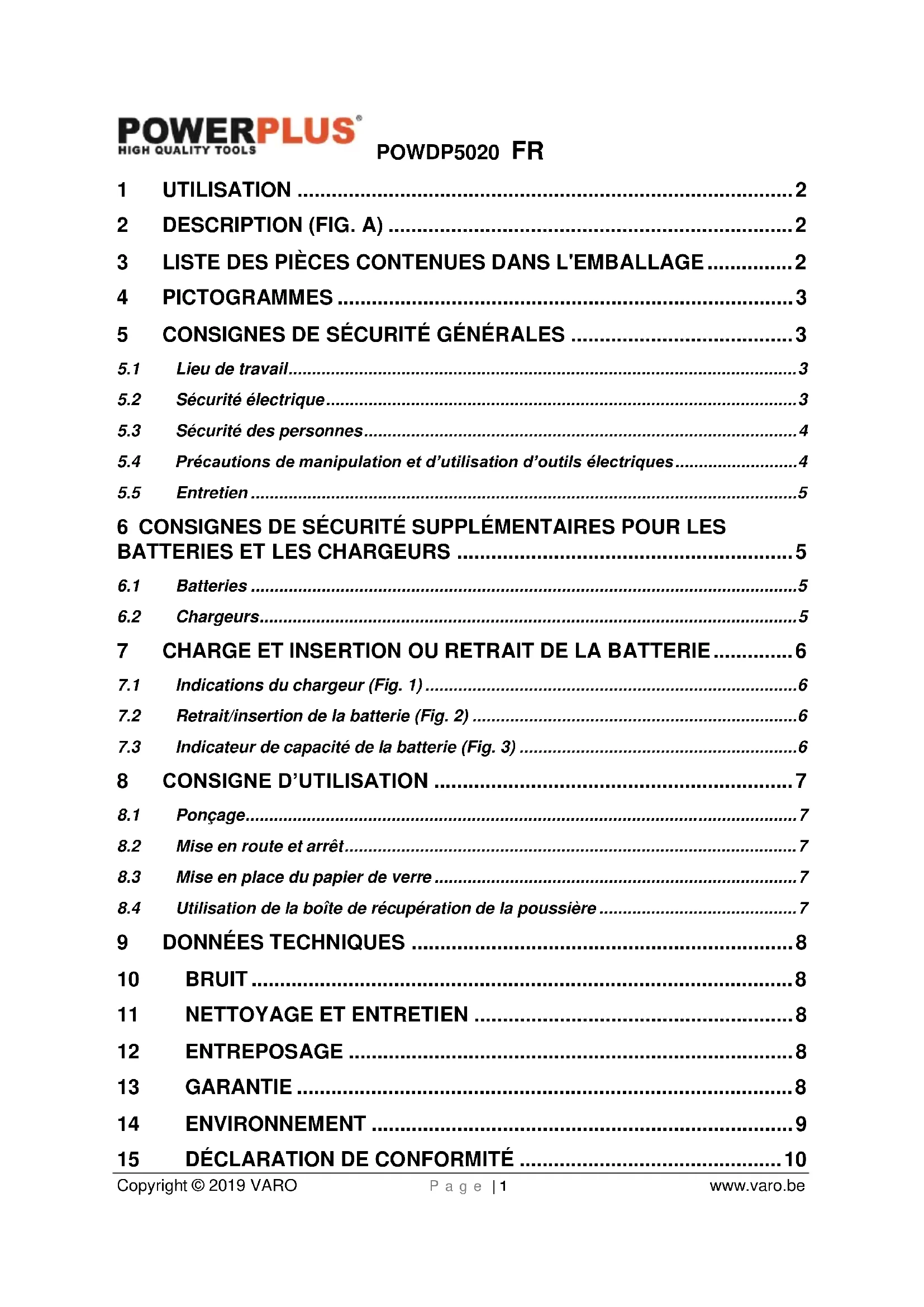 - Votre outil doit être rechargé au moins 1x par mois pour garantir son fonctionnement optimal. 14 ENVIRONNEMENT Si, après un certain temps, vous décidez de remplacer votre machine, ne vous en débarrassez pas avec les ordures ménagères mais destinez-la à un traitement respectueux de l'environnement. Les déchets électriques ne peuvent être traités de la même manière que les ordures ménagères ordinaires. Procédez à leur recyclage, là où il existe des installations adéquates. Renseignez-vous à propos des procédés de collecte et de traitement auprès des autorités locales compétentes ou de votre revendeur.POWDP5020 FR Copyright © 2019 VARO P a g e | 10 www.varo.be