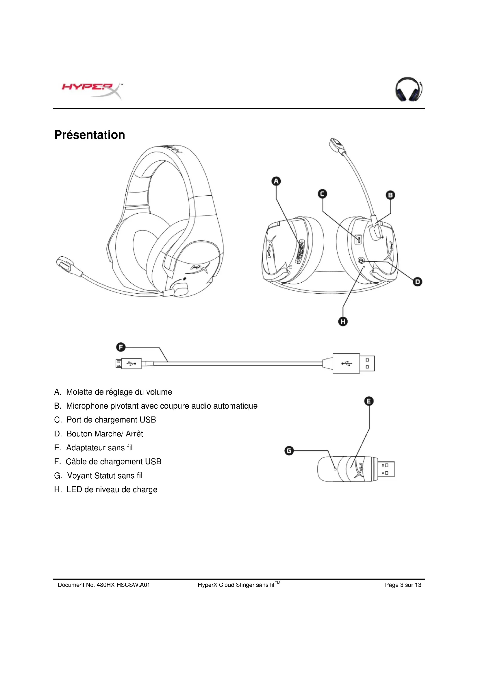 A. Molette de réglage du volume B. Microphone pivotant avec coupure audio automatique C. Port de chargement USB D. Bouton Marche/ Arrêt E. Adaptateur sans fil F. Câble de chargement USB G. Voyant Statut sans fil H. LED de niveau de chargeDocument No. 480HX-HSCSW.A01 HyperX Cloud Stinger sans fil