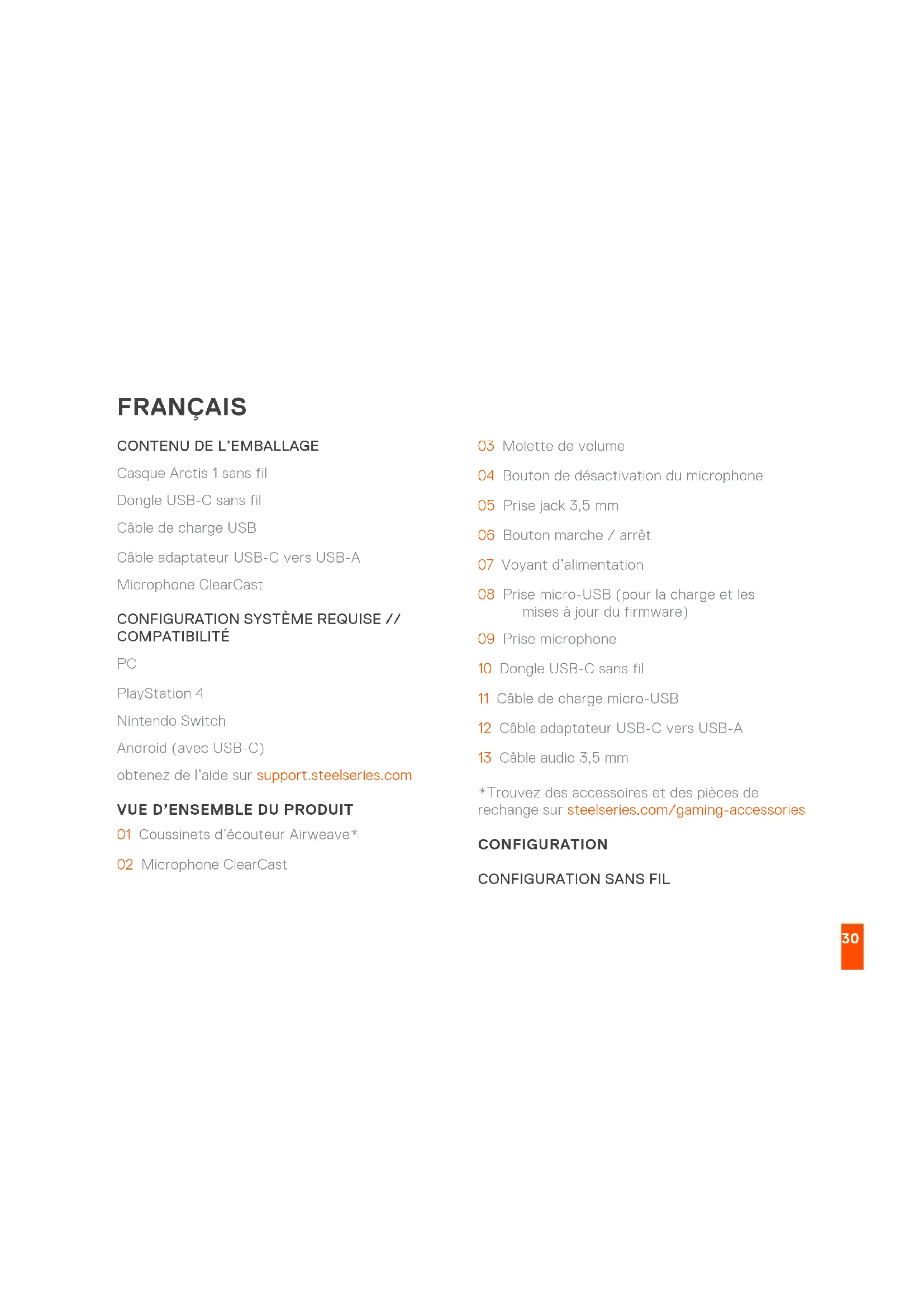 01 Coussinets d’écouteur Airweave* 02 Microphone ClearCast 03 Molette de volume 04 Bouton de désactivation du microphone 05 Prise jack 3,5mm 06 Bouton marche / arrêt 07 Voyant d’alimentation 08 Prise micro-USB (pour la charge et les mises à jour du firmware) 09 Prise microphone 10 Dongle USB-C sans fil 11 Câble de charge micro-USB 12 Câble adaptateur USB-C vers USB-A 13 Câble audio 3,5mm *Trouvez des accessoires et des pièces de rechange sur steelseries.com/gaming-accessories CONFIGURATION