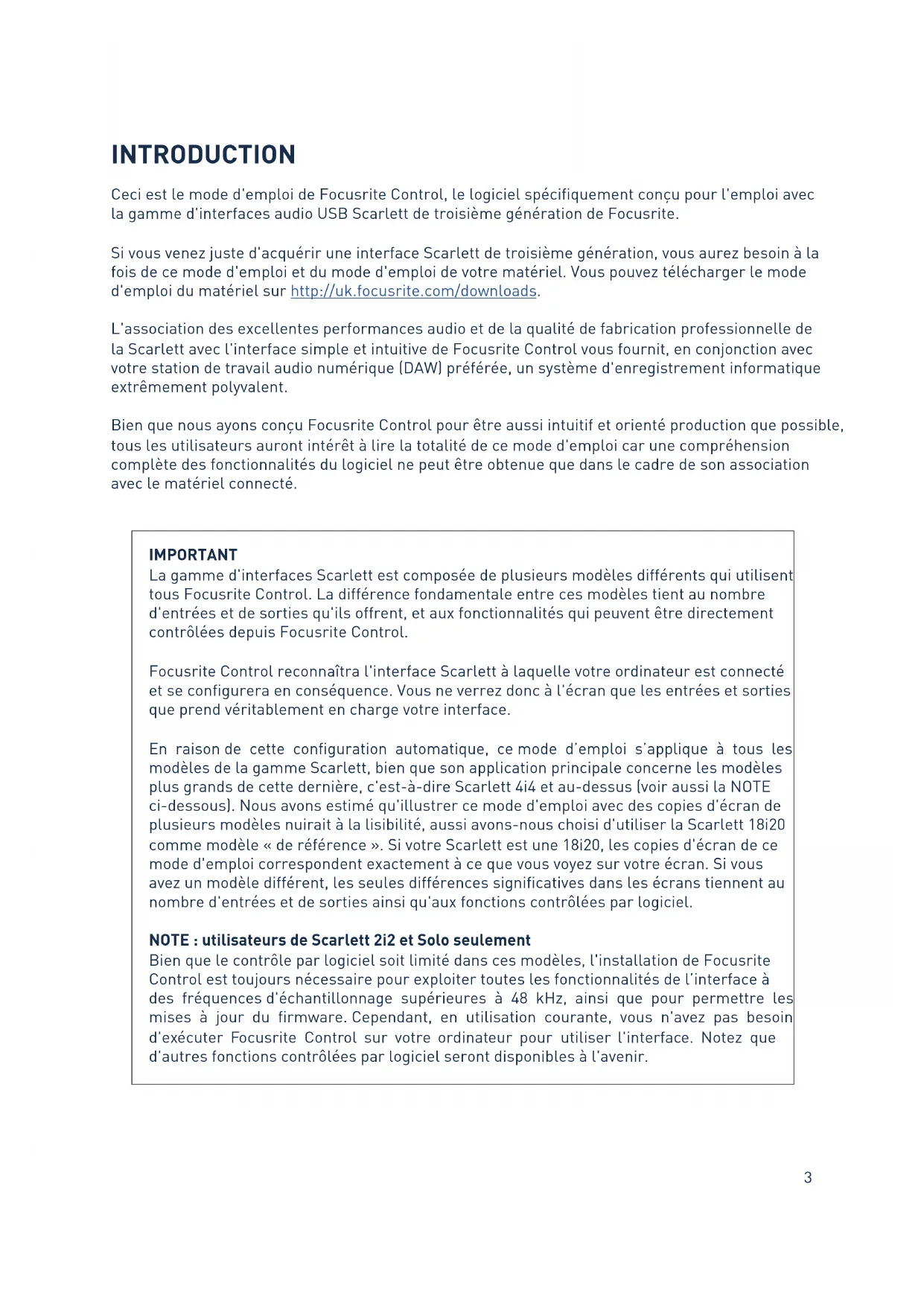INTRODUCTION Ceci est le mode d'emploi de Focusrite Control, le logiciel spécifiquement conçu pour l'emploi avec la gamme d'interfaces audio USB Scarlett de troisième génération de Focusrite. Si vous venez juste d'acquérir une interface Scarlett de troisième génération, vous aurez besoin à la fois de ce mode d'emploi et du mode d'emploi de votre matériel. Vous pouvez télécharger le mode d'emploi du matériel sur http://uk.focusrite.com/downloads. L'association des excellentes performances audio et de la qualité de fabrication professionnelle de la Scarlett avec l'interface simple et intuitive de Focusrite Control vous fournit, en conjonction avec votre station de travail audio numérique (DAW) préférée, un système d'enregistrement informatique extrêmement polyvalent. Bien que nous ayons conçu Focusrite Control pour être aussi intuitif et orienté production que possible, tous les utilisateurs auront intérêt à lire la totalité de ce mode d'emploi car une compréhension complète des fonctionnalités du logiciel ne peut être obtenue que dans le cadre de son association avec le matériel connecté. IMPORTANT La gamme d'interfaces Scarlett est composée de plusieurs modèles différents qui utilisent tous Focusrite Control. La différence fondamentale entre ces modèles tient au nombre d'entrées et de sorties qu'ils offrent, et aux fonctionnalités qui peuvent être directement contrôlées depuis Focusrite Control. Focusrite Control reconnaîtra l'interface Scarlett à laquelle votre ordinateur est connecté et se configurera en conséquence. Vous ne verrez donc à l'écran que les entrées et sorties que prend véritablement en charge votre interface. En raison de cette configuration automatique, ce mode d’emploi s’applique à tous les modèles de la gamme Scarlett, bien que son application principale concerne les modèles plus grands de cette dernière, c'est-à-dire Scarlett 4i4 et au-dessus (voir aussi la NOTE ci-dessous). Nous avons estimé qu'illustrer ce mode d'emploi avec des copies d'écran de plusieurs modèles nuirait à la lisibilité, aussi avons-nous choisi d'utiliser la Scarlett 18i20 comme modèle « de référence ». Si votre Scarlett est une 18i20, les copies d'écran de ce mode d'emploi correspondent exactement à ce que vous voyez sur votre écran. Si vous avez un modèle différent, les seules différences significatives dans les écrans tiennent au nombre d'entrées et de sorties ainsi qu'aux fonctions contrôlées par logiciel. NOTE : utilisateurs de Scarlett 2i2 et Solo seulement Bien que le contrôle par logiciel soit limité dans ces modèles, l'installation de Focusrite Control est toujours nécessaire pour exploiter toutes les fonctionnalités de l’interface à des fréquences d'échantillonnage supérieures à 48 kHz, ainsi que pour permettre les mises à jour du firmware. Cependant, en utilisation courante, vous n'avez pas besoin d'exécuter Focusrite Control sur votre ordinateur pour utiliser l'interface. Notez que d'autres fonctions contrôlées par logiciel seront disponibles à l'avenir.4 Configurations requises IMPORTANT Veuillez utiliser le lien suivant pour accéder à des informations actualisées sur la compatibilité des ordinateurs et systèmes d'exploitation avec Focusrite Control et tous les produits Scarlett : www.focusrite.com/downloads/os Installation des logiciels Tous les logiciels requis par la Scarlett – ainsi que plusieurs suppléments performants et utiles – sont disponibles au téléchargement sur le site web Focusrite (www.focusrite.com/register et www.focusrite.com/downloads). Focusrite Control peut être téléchargé dans le cadre du processus interactif de configuration en ligne, mais il est également disponible sur la page de téléchargement (Downloads) si vous choisissez de ne pas utiliser le processus de configuration en ligne. Installation au cours du processus de configuration en ligne Lors de la première connexion de votre Scarlett (comme détaillé dans son propre mode d’emploi), celle-ci est initialement en mode MSD et vous êtes guidé tout du long du processus de configuration en ligne.