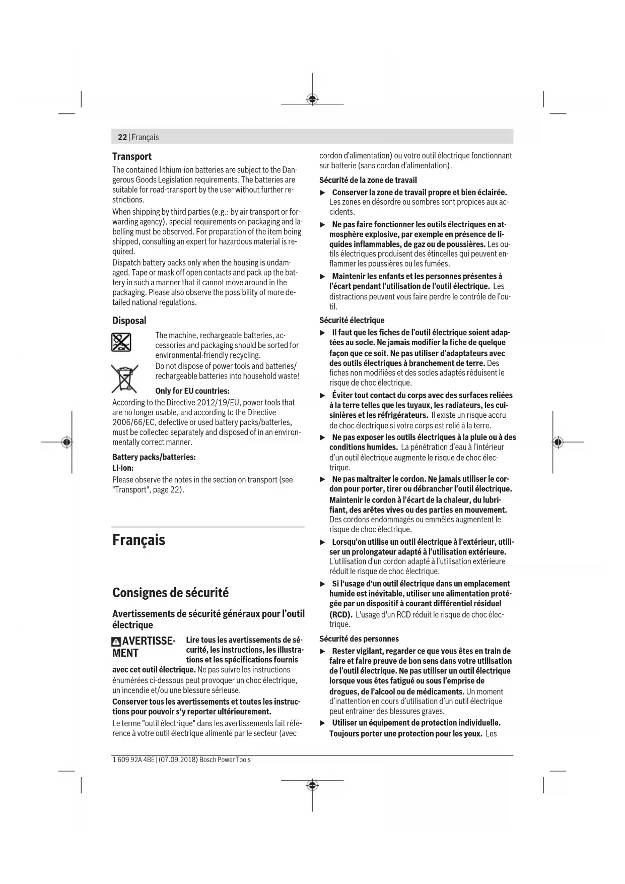 Insert the application tool all the way into the adapter. The application tool is held in the adapter by means of a magnet. Screw holder (see figure D) The screw holder (16) stabilises the screws so that they can be better positioned on the workpiece. Remove the application tool. Push the screw holder onto the tool holder (2) until it aud- ibly engages. Push the magnetic cap (15) as far as it will go towards the power tool. Then push the screwdriver bit (20) onto the screw holder (16) and pull the magnetic cap forwards over the screw- driver bit. Push a screw onto the screwdriver bit. Drill chuck adapter (see figure E) Open the drill chuck adapter (18) by turning it in the direc- tion of rotation ➊ until the application tool can be inserted. Insert the application tool. Firmly tighten the sleeve of the drill chuck adapter (18) by turning it by hand in the direction of rotation ➋. This will automatically lock the drill chuck. Turning the adapter (see figure F) Pull the unlocking ring (1) away from the power tool and then pull the adapter off the tool holder (2). Turn the adapter to the required position and then reattach it. Check that it is seated securely by pulling the adapter. Removing the adapter (see figure G) Remove the application tool. Pull the unlocking ring (1) away from the power tool and then pull the adapter off the tool holder (2). Combining adapters (see figure H) Remove the application tool. Push the angle screw adapter (17) onto the tool holder (2). Check that it is seated securely by pulling the angle screw adapter (17). Push the drill chuck adapter (18) onto the angle screw ad- apter (17). Check that it is seated securely by pulling the drill chuck ad- apter (18). Dust/Chip Extraction Dust from materials such as lead-containing coatings, some wood types, minerals and metal can be harmful to one’s English | 19 Bosch Power Tools 1 609 92A 4BE | (07.09.2018)20 | English 1 609 92A 4BE | (07.09.2018) Bosch Power Tools health. Touching or breathing-in the dust can cause allergic reactions and/or lead to respiratory infections of the user or bystanders. Certain dust, such as oak or beech dust, is considered carci- nogenic, especially in connection with wood-treatment ad- ditives (chromate, wood preservative). Materials containing asbestos may only be worked by specialists. – Provide for good ventilation of the working place. – It is recommended to wear a P2 filter-class respirator. Observe the relevant regulations in your country for the ma- terials to be worked. u Avoid dust accumulation at the workplace. Dust can easily ignite. Operation Starting Operation Inserting the battery Push the charged battery (9) into the base of the power tool from the rear until the battery is securely locked. Setting the rotational direction The electronic rotational direction switch (7) is used to change the rotational direction of the power tool. However, this is not possible while the on/off switch (14) is being pressed. Setting right rotation (see figure I) To drill and drive in screws, push the electronic rotational direction switch (7) down. The rotational direction indicator for right rotation (5) lights up when the on/off switch (14) is pressed, the rotational direction switch (7) is pressed and the motor is running. Setting left rotation (see figure J) To loosen or undo screws and nuts, push the electronic rota- tional direction switch (7) down. The rotational direction indicator for left rotation (6) lights up when the on/off switch (14) is pressed, the rotational direction switch (7) is pressed and the motor is running. Preselecting the torque The torque presetting ring (3) can be used to preselect the required torque in 20 stages and "MAX". Once the set torque has been reached, the application tool will be stopped. Setting the operating mode (see figure K) u Only operate the mode selector switch (4) when the power tool is not in use. You can pre-select two speed ranges with the mode selector switch (4). Screwdriving mode (first screw phase): Low speed range; for screwdriving or working with a large drilling diameter. Drilling/impact drilling mode (second screw phase): High speed range; for working with a small drilling diameter. Screwdriving Set the torque presetting ring (3) to the re- quired torque. Set the mode selector switch (4) to the "screwdriving" symbol. Drilling Set the torque presetting ring (3) to "MAX". Set the mode selector switch (4) to the "drilling" symbol. Impact drilling (AdvancedImpact 18) Set the torque presetting ring (3) to "MAX". Set the mode selector switch (4) to the "im- pact drilling" symbol. Switching on/off To start the power tool, press and hold the on/off switch (14). The light (12) lights up when the on/off switch (14) is lightly or fully pressed, meaning that the work area is illuminated in poor lighting conditions. To switch off the power tool, release the on/off switch (14). Adjusting the Speed You can adjust the speed of the power tool when it is on by pressing in the on/off switch to varying extents. Applying light pressure to the on/off switch results in a low rotational speed. Applying increasing pressure to the switch increases the speed. Fully automatic spindle lock (Auto-Lock) The drill spindle, and therefore the tool holder, are locked when the on/off switch (14) is not pressed. This allows screws to be driven in even when the battery is discharged and enables the power tool to be used as a screwdriver. Temperature-dependent overload protection In normal conditions of use, the power tool cannot be over- loaded. If the power tool is overloaded or the permitted bat- tery temperature is exceeded, the electronics of the power tool will switch off until the temperature returns to within the optimum operating temperature range. The three LEDs in the battery charge indicator (13) and the PowerLight (12) flash quickly when the temperature of the battery is outside the operating temperature range of –20 to +50 °C and/or the overload pr